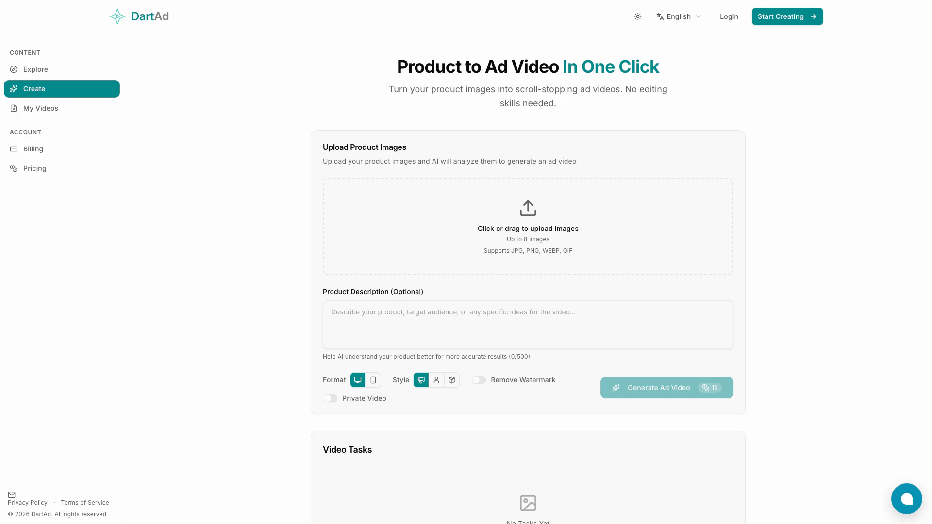 DartAd is an innovative tool designed to transform product images into engaging advertisement videos with just one click. It eliminates the need for any editing skills, making it accessible for users of all levels. By simply uploading product images, DartAd utilizes AI technology to analyze the visuals and generate captivating ad videos that are perfect for e-commerce promotions. This tool aims to streamline the ad creation process, allowing businesses to effectively showcase their products in a dynamic format that captures audience attention.
