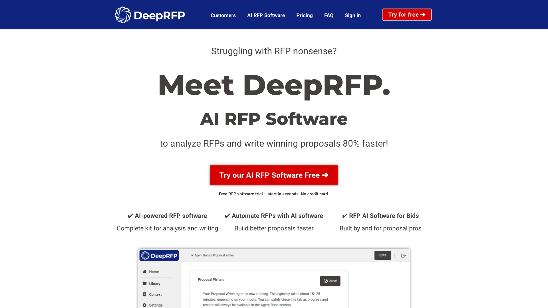 Draft compliant proposals 10× faster with DeepRFP—the AI proposal software built for proposals. Unlike generic chatbots like ChatGPT or Copilot, DeepRFP doesn’t need constant prompting or fine-tuning. It’s not a chatbot; it’s a kit of smart, focused AI agents designed to handle real-world tasks like proposal drafts and tender analysis in one click. Even junior staff get wins on day one.