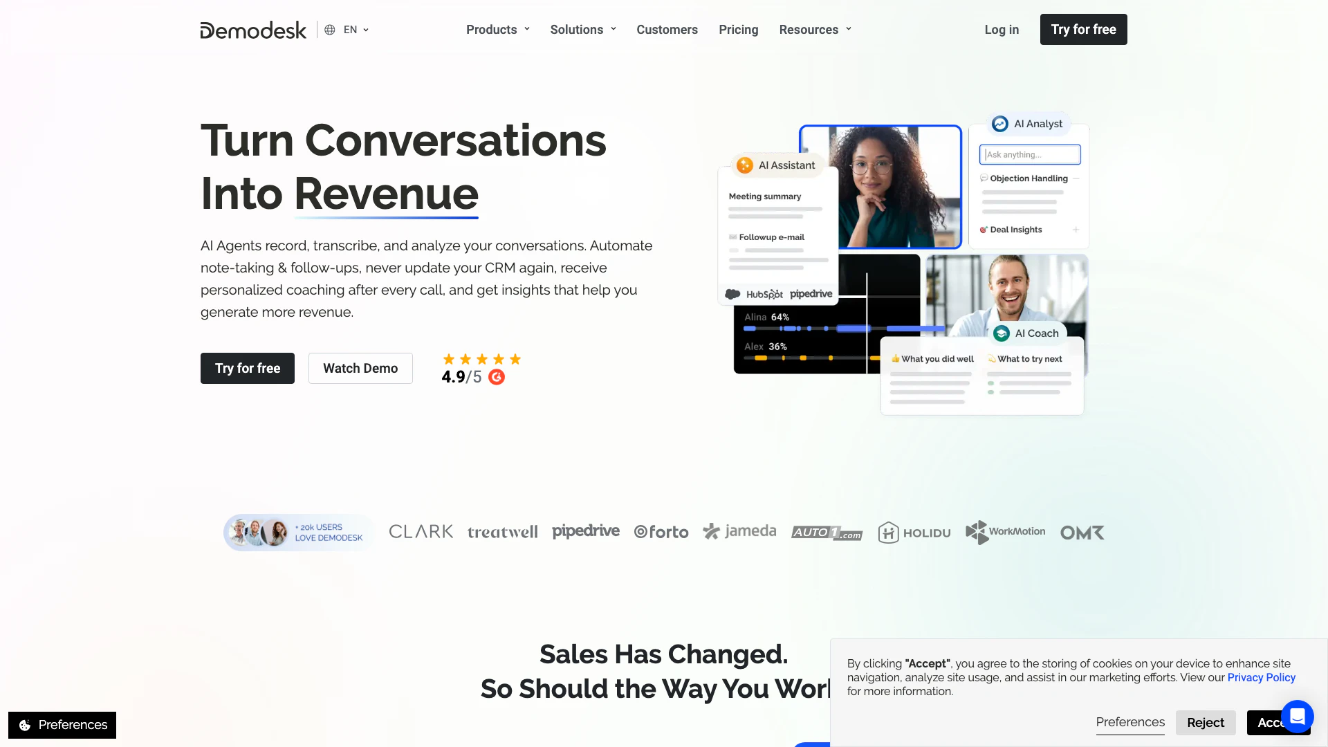Demodesk is an innovative sales platform that leverages cutting-edge AI technology to enhance sales processes and improve team productivity. With its AI Sales Agents[1], Demodesk automates numerous tasks including conversation analysis[2], CRM updates, and sales coaching[5]. This tool is designed to streamline workflows, reduce manual effort, and provide real-time insights[4], enabling sales teams to focus more on selling and less on administrative tasks. By utilizing AI, Demodesk transforms conversations into actionable insights that drive revenue growth.