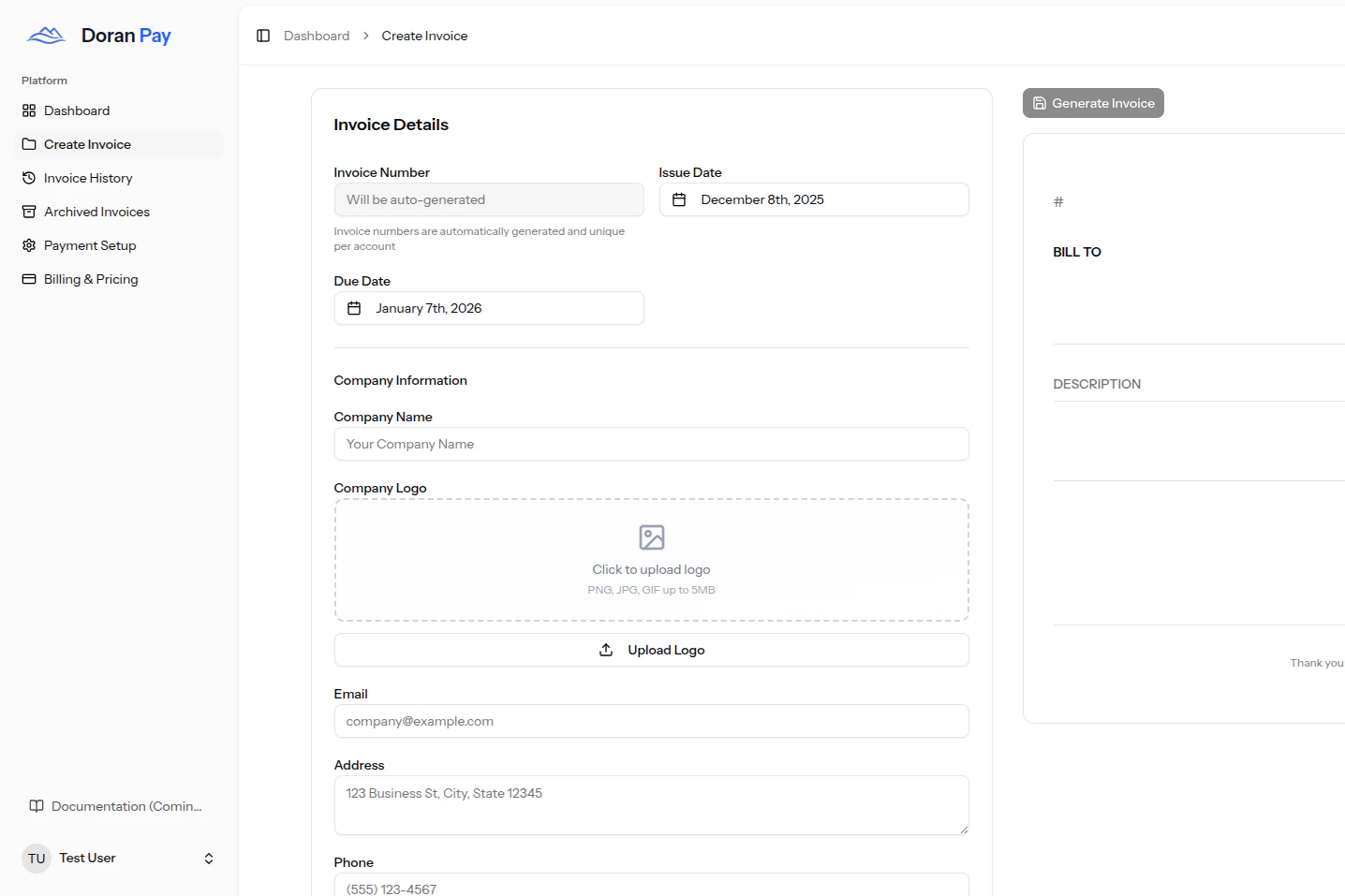 I was looking for this type of platform to get my payments. Doran Pay makes the invoice processing fast and stress-free. It makes user-friendly with clear layout and smooth navigation. Their customer support team stands out as well—responsive, knowledgeable; even, very supportive if someone does not have any idea about creating invoices. Overall, Doran Pay provides a reliable service that is combined with excellent support, creating a consistently positive transaction experience.