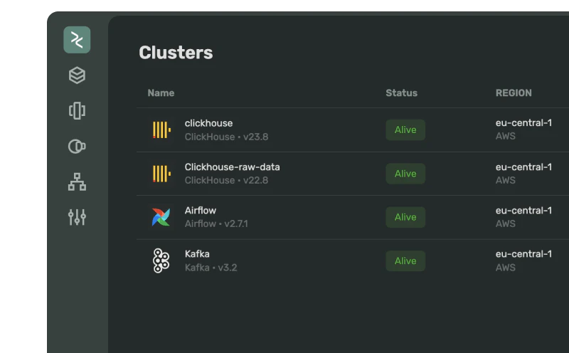 - Managed Services: Offers managed open-source services such as ClickHouse, Kafka, and Airflow, ensuring high performance and reliability.