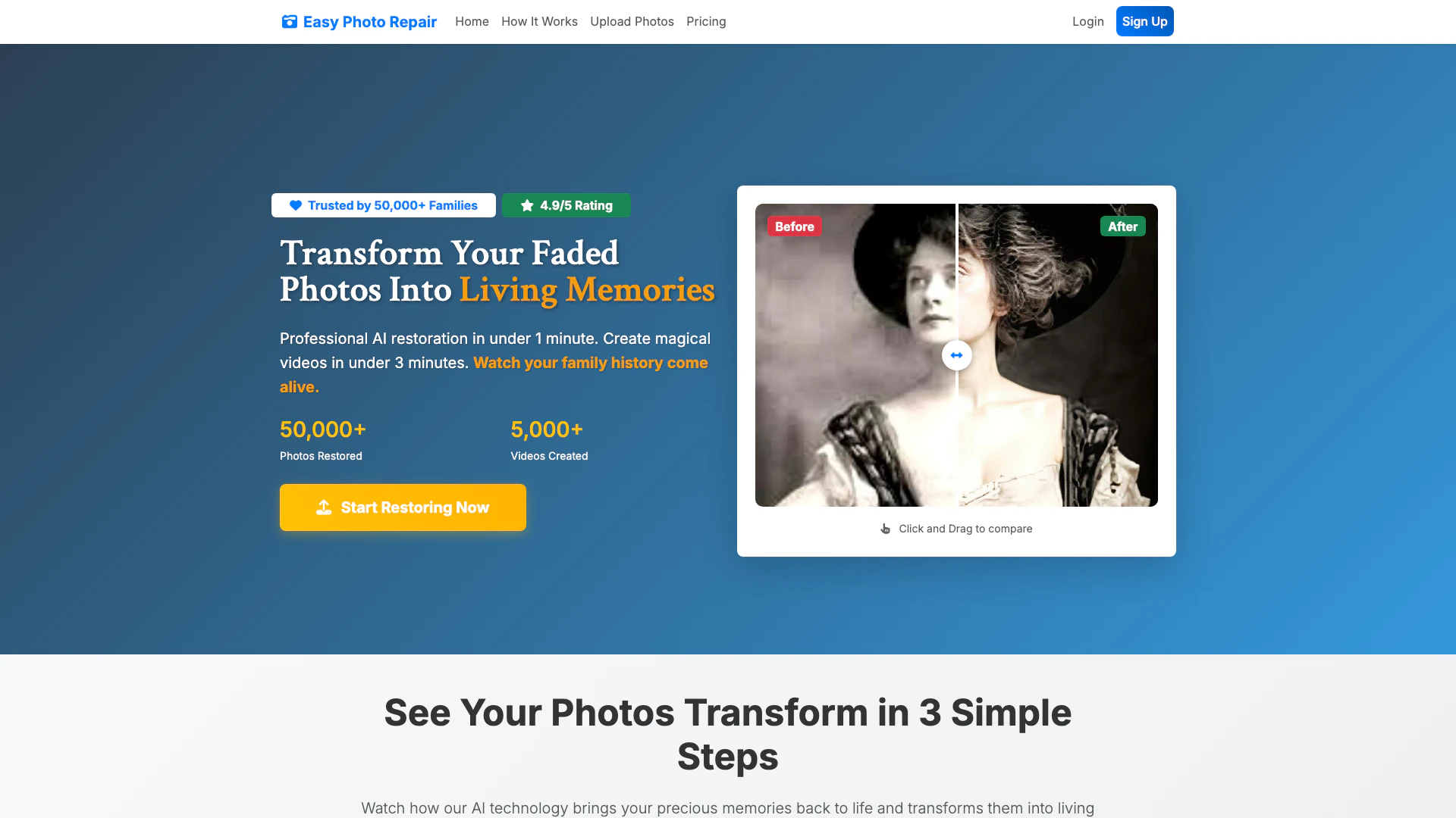 Easyphotorepair is ideal for anyone looking to restore and preserve their cherished family memories. This includes individuals with old family photos that have faded over time, couples wanting to revive their wedding memories, and families aiming to maintain their heritage through restored images. Additionally, veterans or their families who wish to preserve historical photographs, as well as anyone interested in creating living memories through video, will find Easyphotorepair to be a valuable tool.