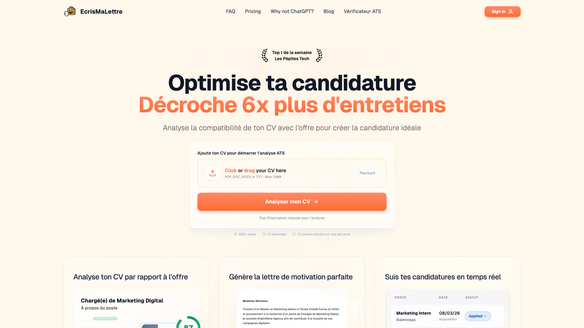 EcrisMaLettre is a tool that analyzes your CV and generates personalized cover letters in seconds using AI. It calculates your compatibility score with job offers and provides a tailored letter.