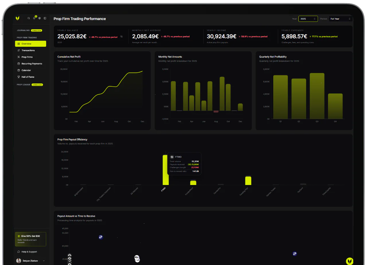 - Complete Analytics Suite: Track spending and payouts across multiple prop firms with real-time performance metrics.