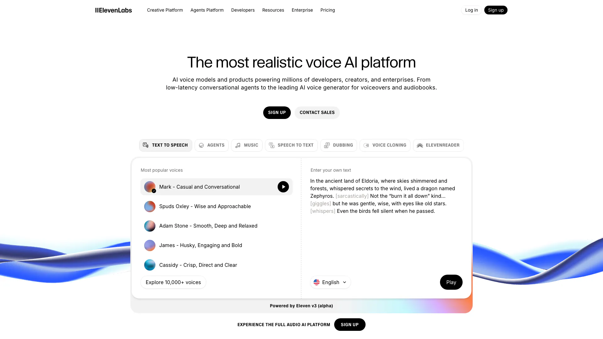 ElevenLabs is an advanced AI voice generator[1] and voice agents[3] platform that allows users to create lifelike speech[2]. With access to over 5,000 voices in more than 70 languages, ElevenLabs provides developers, creators, and enterprises with the tools to integrate high-quality audio into their applications. This platform is designed to power various use cases, including audiobooks, video voiceovers, dubbing, and customer service solutions, all while ensuring a seamless and engaging user experience.