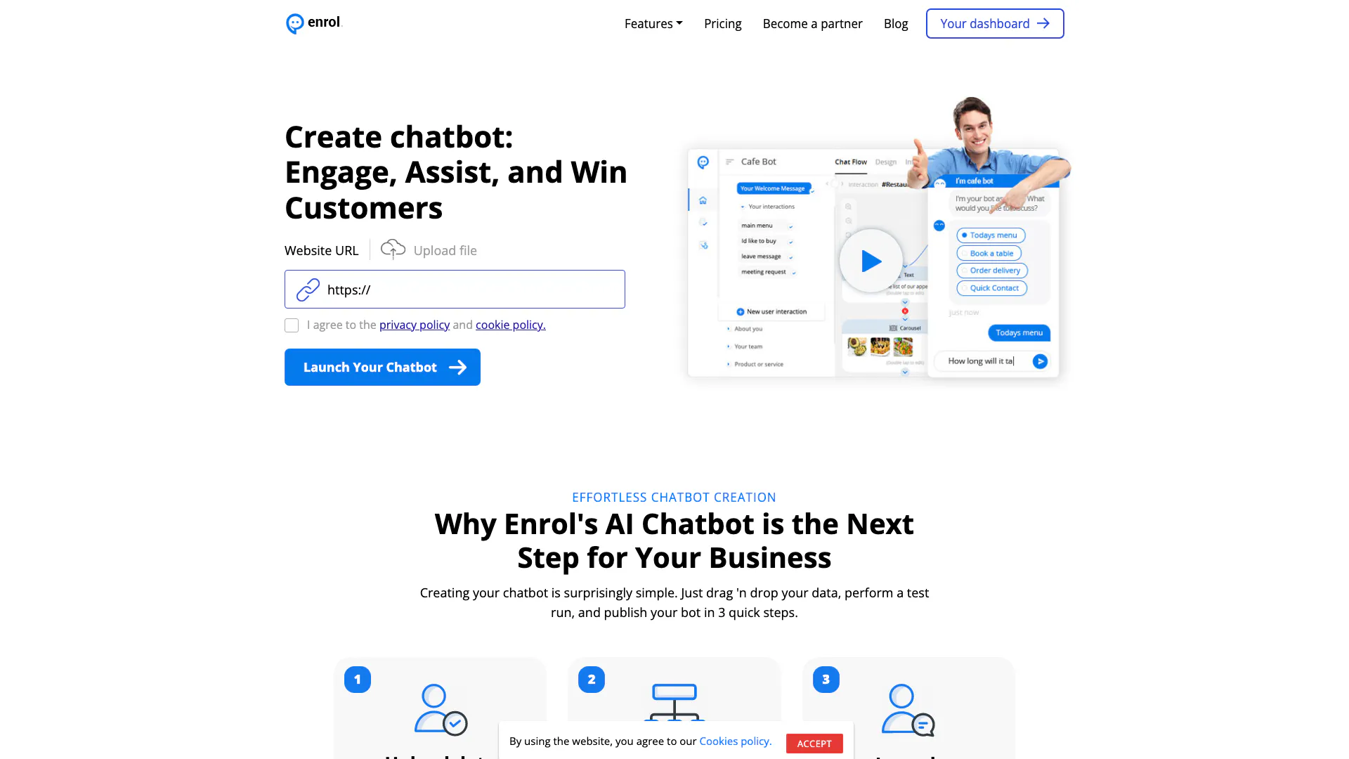Creating your chatbot is surprisingly simple. Just drag 'n drop your data, perform a test run, and publish your bot in 3 quick steps.