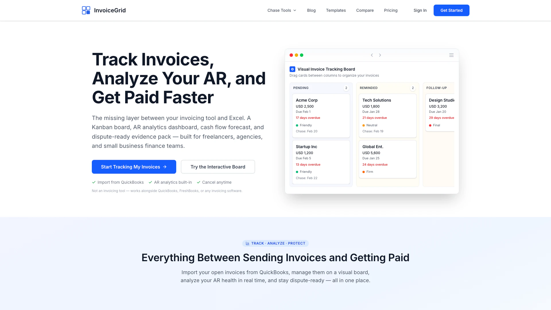 InvoiceGrid is a visual AR management and invoice tracking platform. It sits between your invoicing tool (like QuickBooks or FreshBooks) and your bank account — giving you a Kanban board to track every unpaid invoice, a Today View for daily follow-ups, an Analytics dashboard with real metrics (Collection Rate, DSO, cash flow forecast, AR aging), client risk scoring, professional reminder email generation, and a one-click Evidence Pack for disputes. It replaces the Excel spreadsheet most freelancers and small businesses use to track who owes what.