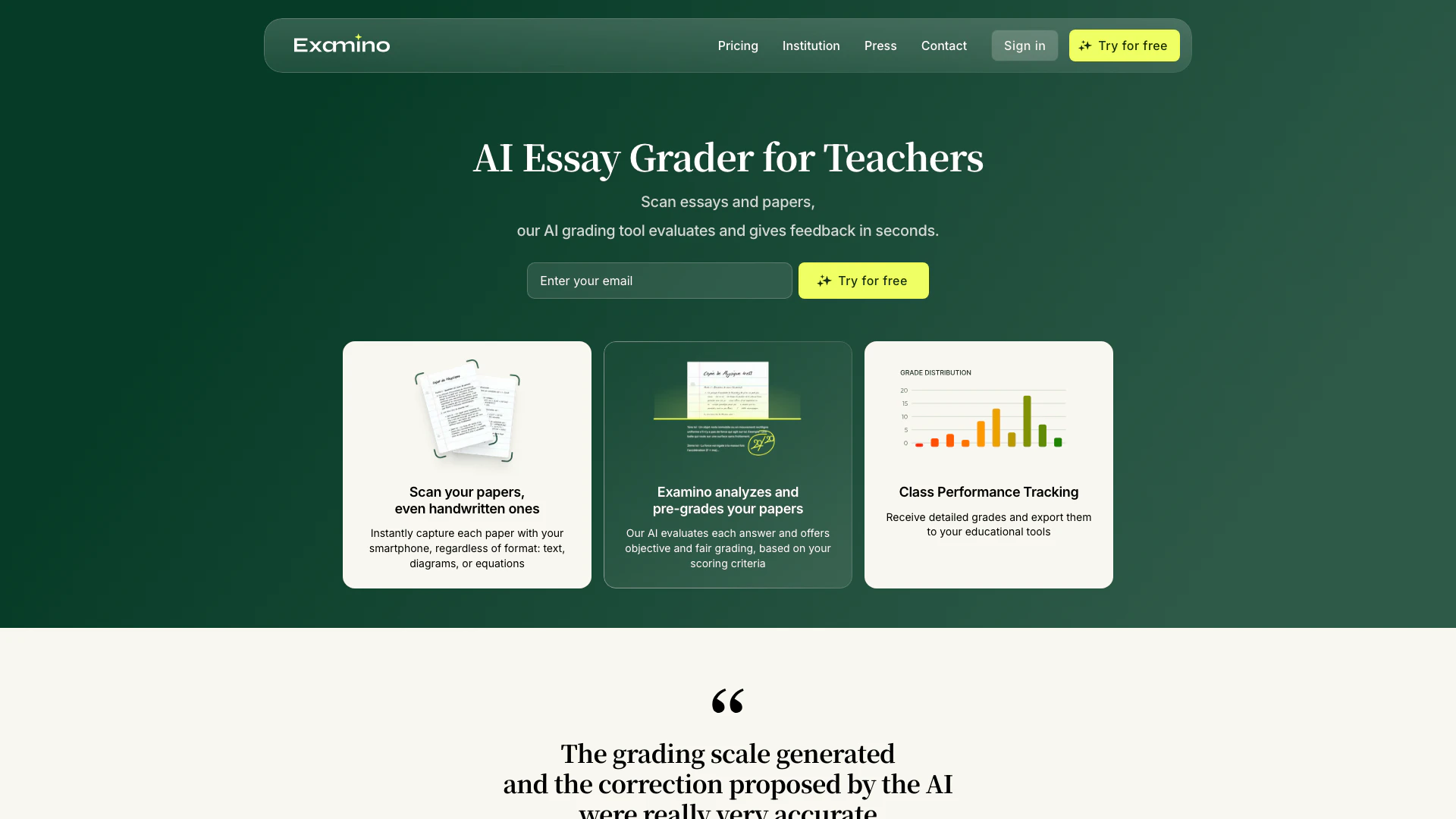 Examinoai is an advanced AI essay grading tool designed to assist educators in evaluating student essays efficiently. This innovative platform allows teachers to upload class sets of essays and receive instant, fair, and rubric-based feedback. With Examinoai, educators can scan handwritten papers using a smartphone, enabling quick and accurate grading. The tool is built to save teachers valuable time, transforming hours of grading into mere minutes while ensuring objective and consistent evaluation across various subjects and grade levels.