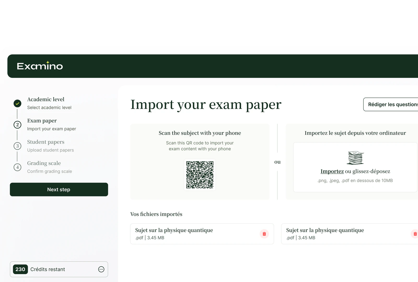 To grade an exam with the Examino app, first import your assessment subject (in PDF format, for example). Then, add scans of your students' handwritten papers by either importing existing scans or using your smartphone's camera connected to the app. Next, review and validate the scoring system and expected answers for each question, which are detected and pre-filled by AI from your assessment subject. Launch the grading process and wait a few seconds!