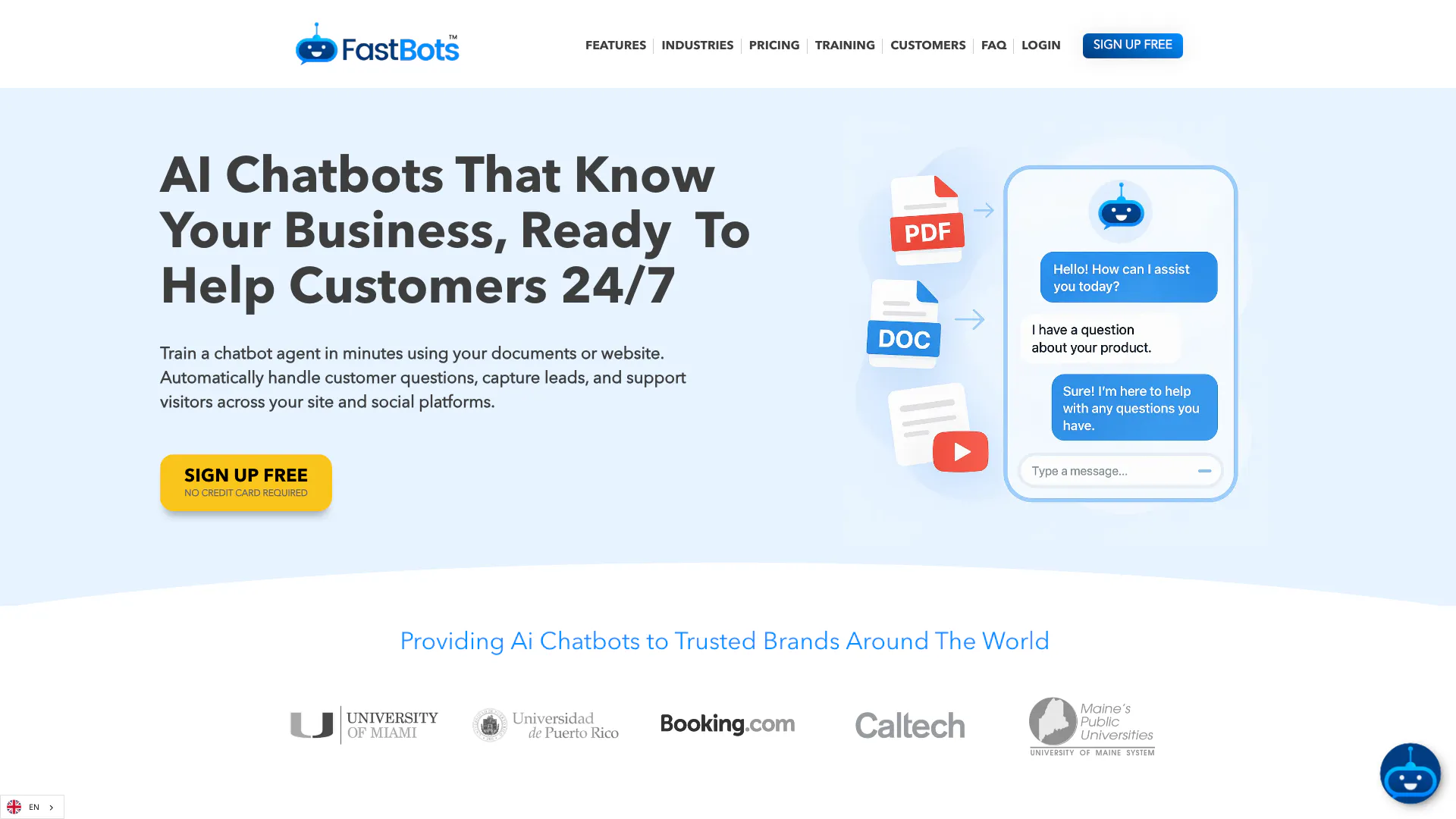 FastBots is an innovative AI chatbot platform that enables businesses to create custom AI chatbots[1] and agents powered by their own data. Designed to provide 24/7 customer support, FastBots can be seamlessly integrated into websites and social media channels, allowing businesses to enhance their customer engagement[5] and support. With FastBots, users can train chatbots using various data formats, ensuring that the AI has the necessary knowledge to assist customers effectively.