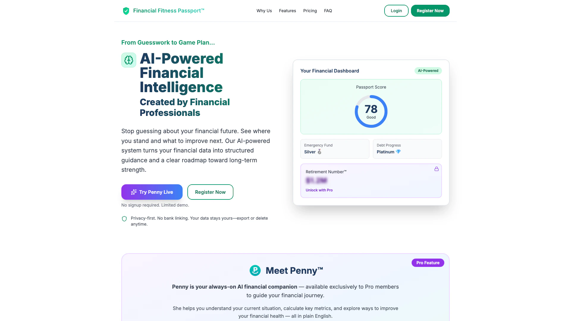 Financial Fitness Passport is an innovative AI-powered[1] financial guidance[5] software designed to help users understand their financial health and prepare for a secure retirement. This tool features a unique Retirement Number™[2], personalized Passport Score, and a suite of smart calculators[3], all while prioritizing user privacy by eliminating the need for bank linking. By providing structured financial guidance and personalized insights[4], Financial Fitness Passport empowers individuals to take control of their financial futures.