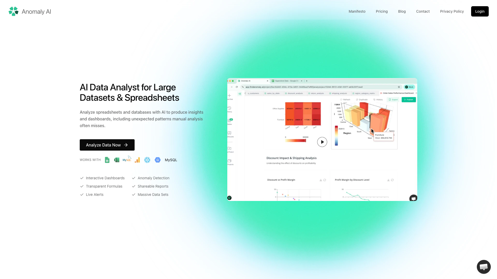 Findanomalyai is an AI-powered data analyst designed for large datasets and spreadsheets. It enables users to analyze data from various sources, including Excel, Google Sheets, BigQuery, and other databases, generating actionable insights and dashboards in just minutes. The tool leverages advanced algorithms to detect anomalies and patterns that traditional manual analysis might overlook, making it an essential asset for teams looking to enhance their data-driven decision-making capabilities.