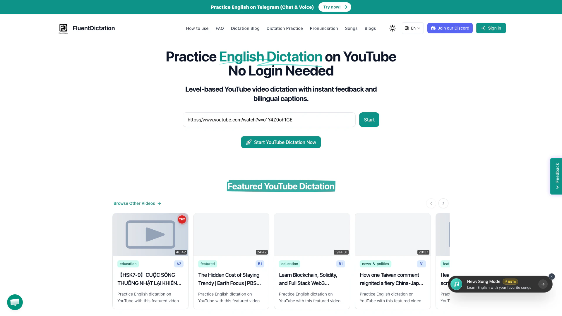Simply paste a URL, press start, and the video transforms into interactive YouTube dictation exercises. Basic english dictation practice tools are free—no sign-up required.