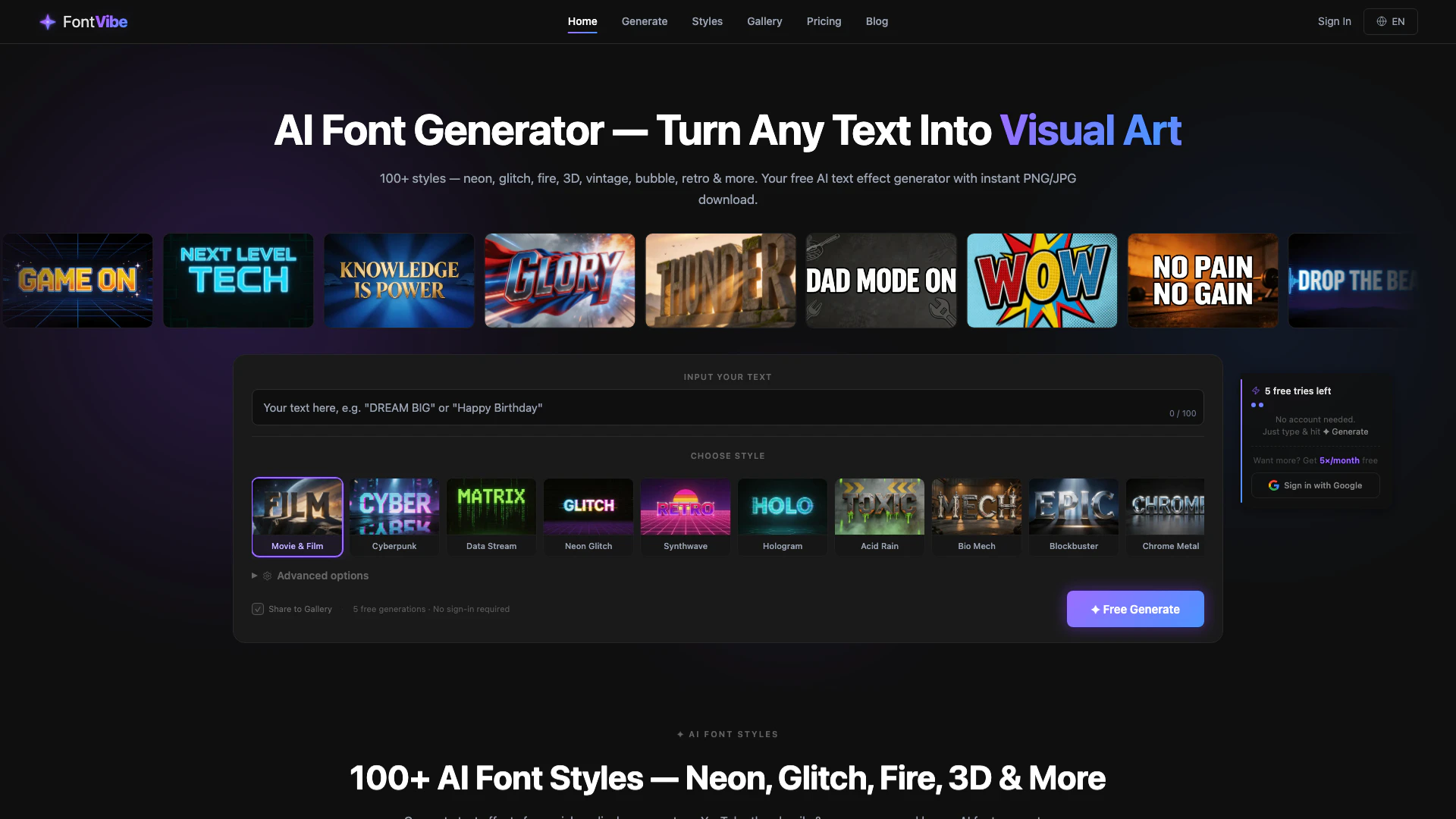 FontVibe is an AI font generator that creates styled text images. You type your words, pick a visual style (like neon glow, 3D, fire, or vintage), and the AI renders a finished image in about 20–30 seconds. The output is a ready-to-use PNG or JPG — not a font file, but a visual asset you can drop straight into your project.