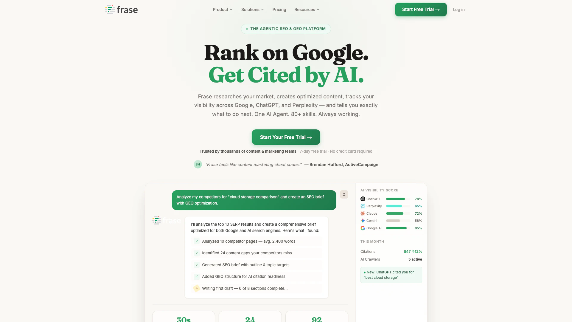 Frase is an agentic SEO and GEO platform. It researches your market, creates optimized content, tracks your visibility across Google and AI search engines like ChatGPT and Perplexity, and shows you exactly what to do next. The AI Agent brings 80+ specialized skills to your team — handling everything from competitive research to content creation to AI visibility tracking. Thousands of teams trust Frase.
