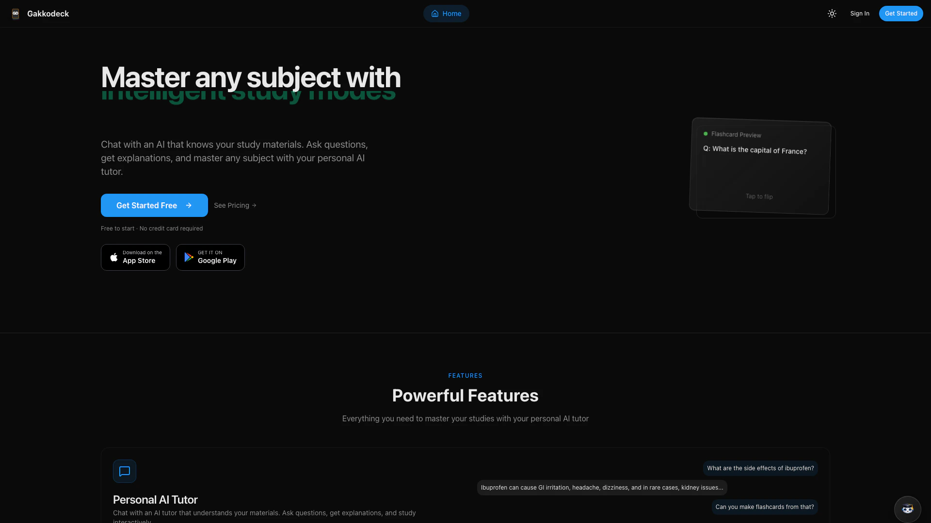 Gakkodeck is a personal AI tutor that helps you master any subject by understanding your study materials, allowing you to ask questions, get explanations, and study interactively.