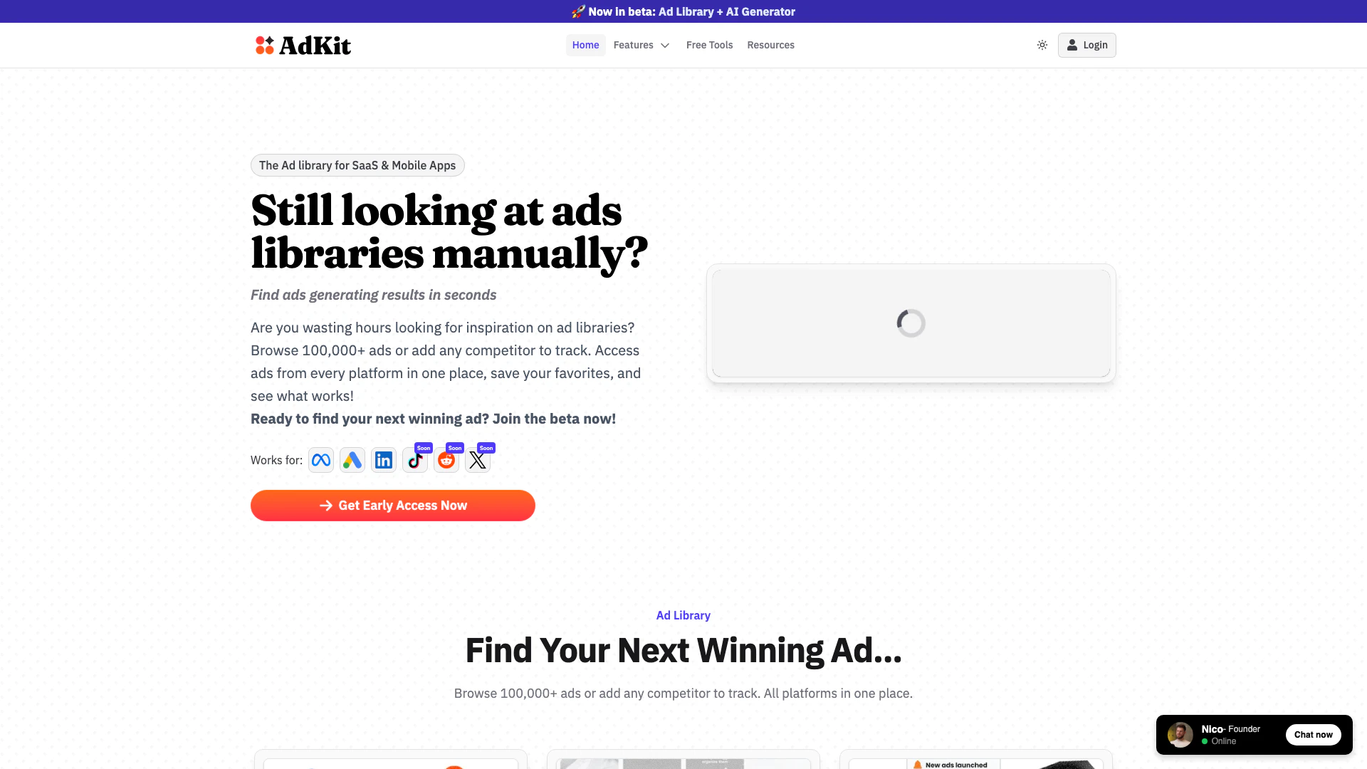 - Comprehensive Ad Library: Access over 100,000 ads from multiple platforms like Meta, Google, and LinkedIn in one place, saving time and effort.