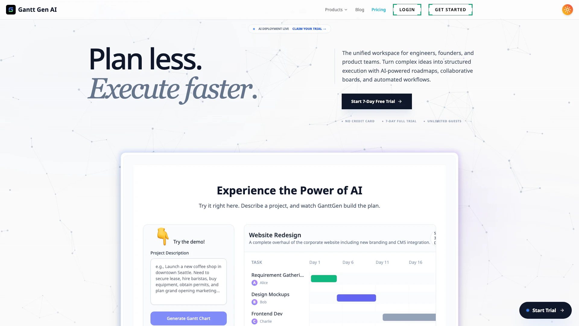 Ganttgenai is an innovative project management tool that leverages artificial intelligence to streamline the creation of Gantt charts[2], Kanban boards[3], and NoteBoards[4]. This platform is designed to help teams ship projects faster by automating planning processes and reducing overhead. With Ganttgenai, users can generate professional project timelines[5] in seconds, collaborate in real-time, and manage tasks effortlessly, thus allowing them to focus more on execution rather than planning.