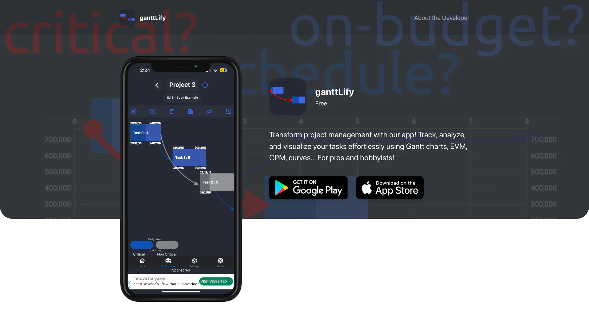 Ganttlify is a comprehensive project management application designed to transform how users track, analyze, and visualize their tasks. Utilizing powerful tools like Gantt chart[1]s, Earned Value Management[2] (EVM), and the Critical Path Method[3] (CPM), Ganttlify caters to both professionals and hobbyists. The app simplifies project management by allowing users to monitor task dependencies[5], deadlines, and overall progress, making it an essential tool for effective project planning and execution.