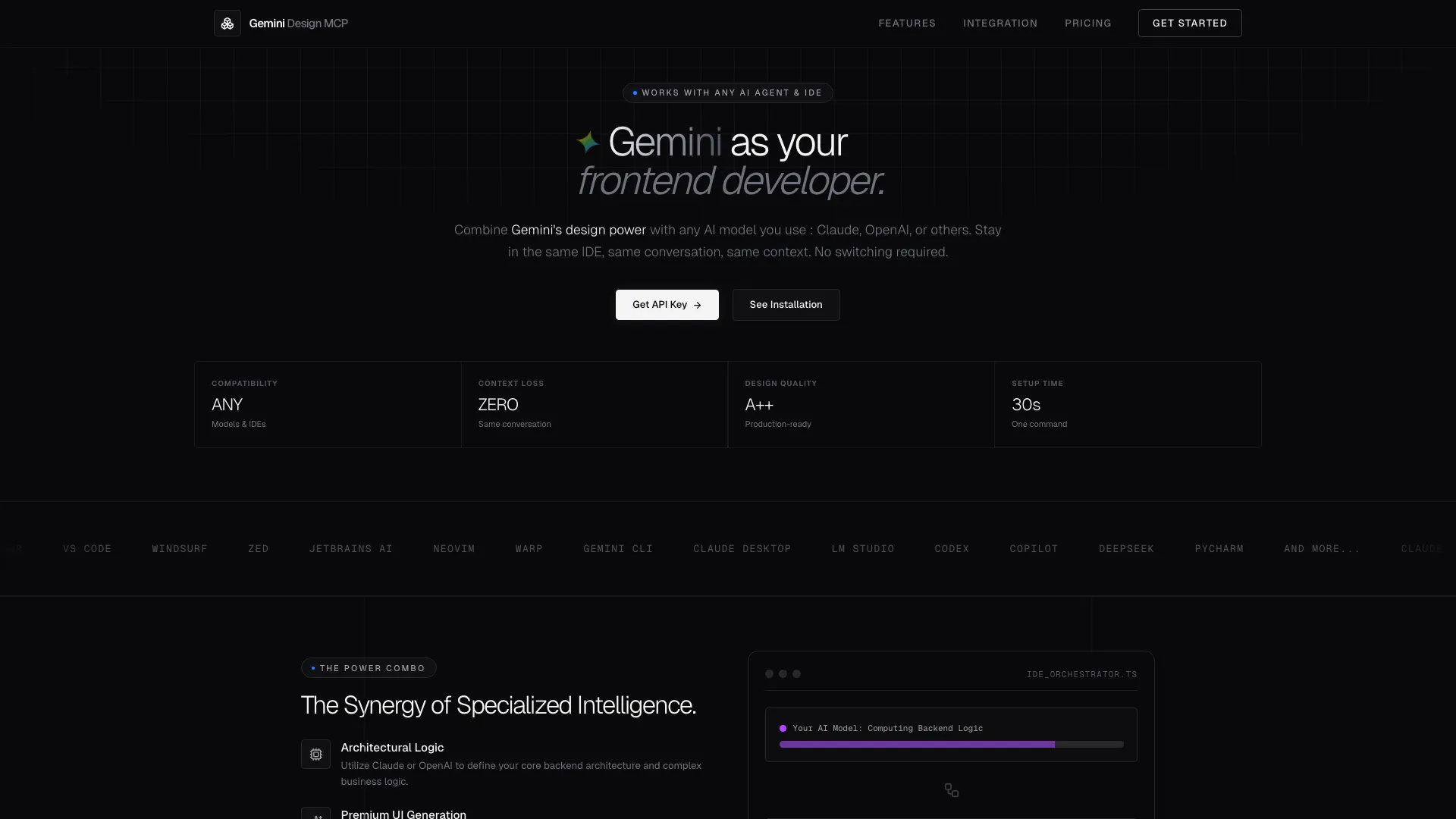 Gemini Design MCP is a premium frontend design generation tool specifically designed for AI agents. It integrates seamlessly with various AI models, such as Claude and OpenAI, allowing developers to generate high-quality, production-ready UI components directly within their existing Integrated Development Environments (IDEs). By maintaining context and conversation continuity, Gemini ensures that developers can focus on building robust applications without the need for context switching. This tool is engineered to facilitate rapid frontend development while preserving the integrity of backend logic, making it an essential asset for developers looking to enhance their UI creation process.