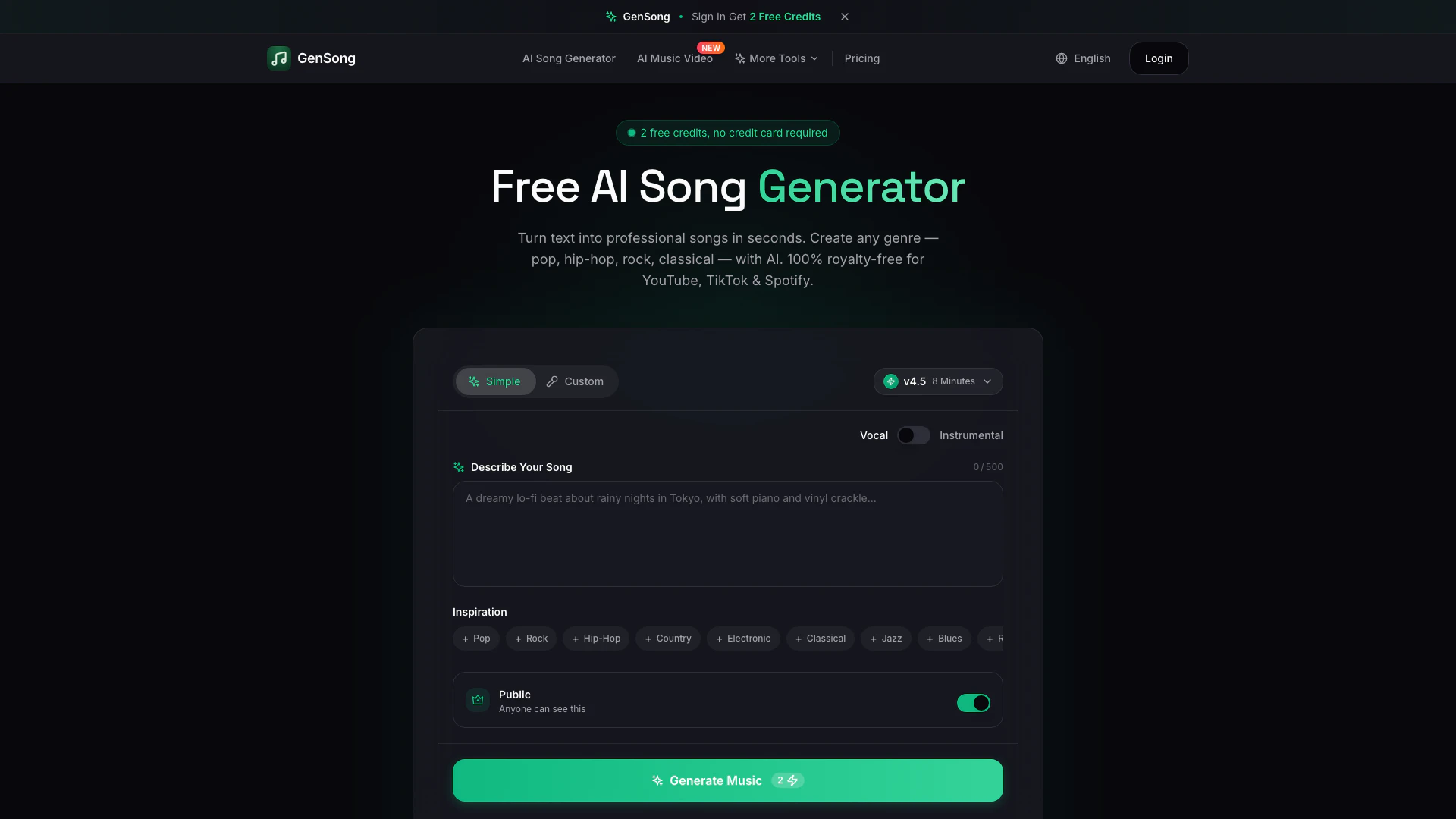Try GenSong for free with 2 generations and 4 songs. Free trial on first sign up. Includes Commercial License and Private Generation.