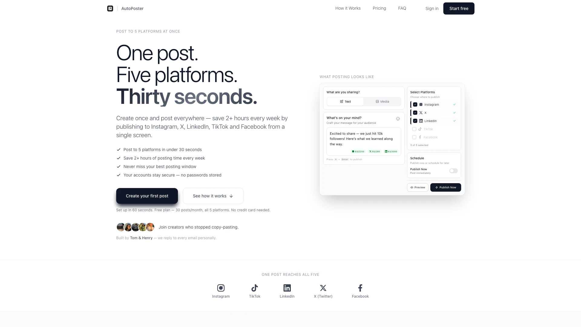 5 platforms included: Instagram, TikTok, LinkedIn, X (Twitter), Facebook. Unlimited posts. Post as much as you want, no limits. Text, image & video support. Upload once, deliver to every platform. Personal support from the founders.
