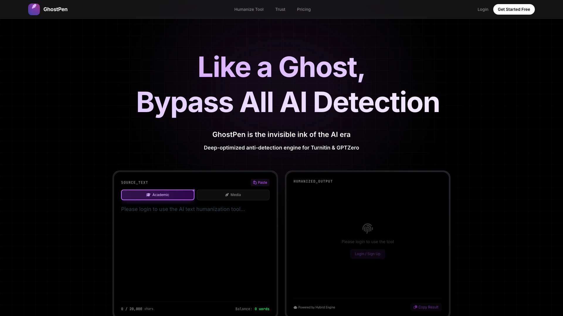 Getghostpen is an innovative AI tool designed to convert ChatGPT-generated text into 100% human-like writing instantly. This powerful tool aims to help students and writers bypass AI detection[3] systems such as Turnitin, GPTZero, and Originality.ai. By utilizing a deep-optimized anti-detection engine[2], Getghostpen effectively removes the 'AI fingerprint' from text while preserving its original meaning, ensuring that the output reads naturally and authentically. With its user-friendly interface[4] and reliable performance, Getghostpen is becoming a go-to solution for anyone needing to humanize AI-generated content.