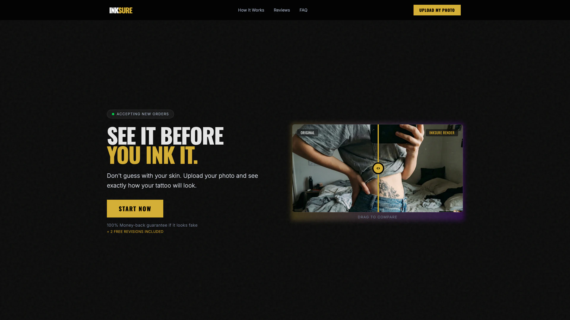 - See Your Future Ink: Wait for up to 12 hours to receive 3-4 ultra-realistic mockups showing how the tattoo will look on your skin. You also get 2 free revisions if adjustments are needed.