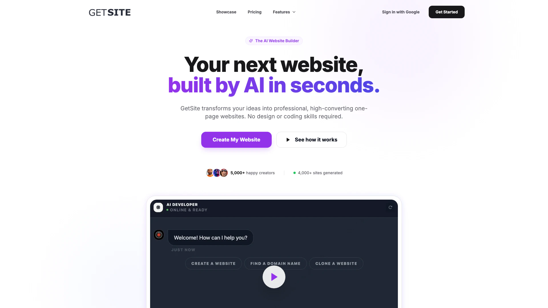 - AI builds your site: Watch as GetSite generates a custom design, copy, and layout based on your inputs in seconds.