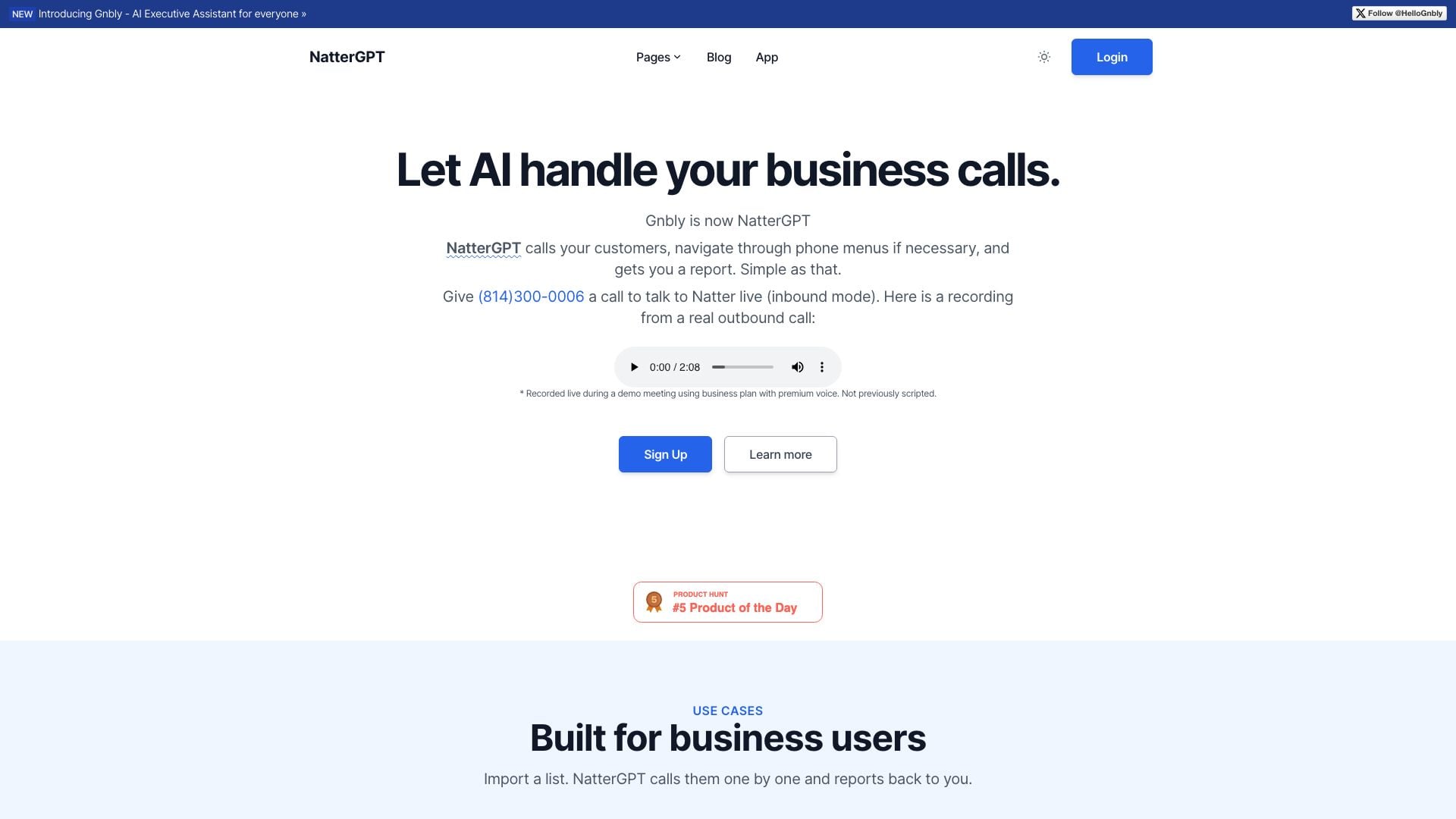 Gnbly, now known as NatterGPT, is an AI-powered executive assistant designed to manage business calls efficiently. This innovative tool automates the process of calling customers, navigating through phone menus, and generating comprehensive reports. By utilizing advanced artificial intelligence, Gnbly streamlines communication tasks, allowing businesses to focus on their core operations while ensuring that customer interactions are handled seamlessly.