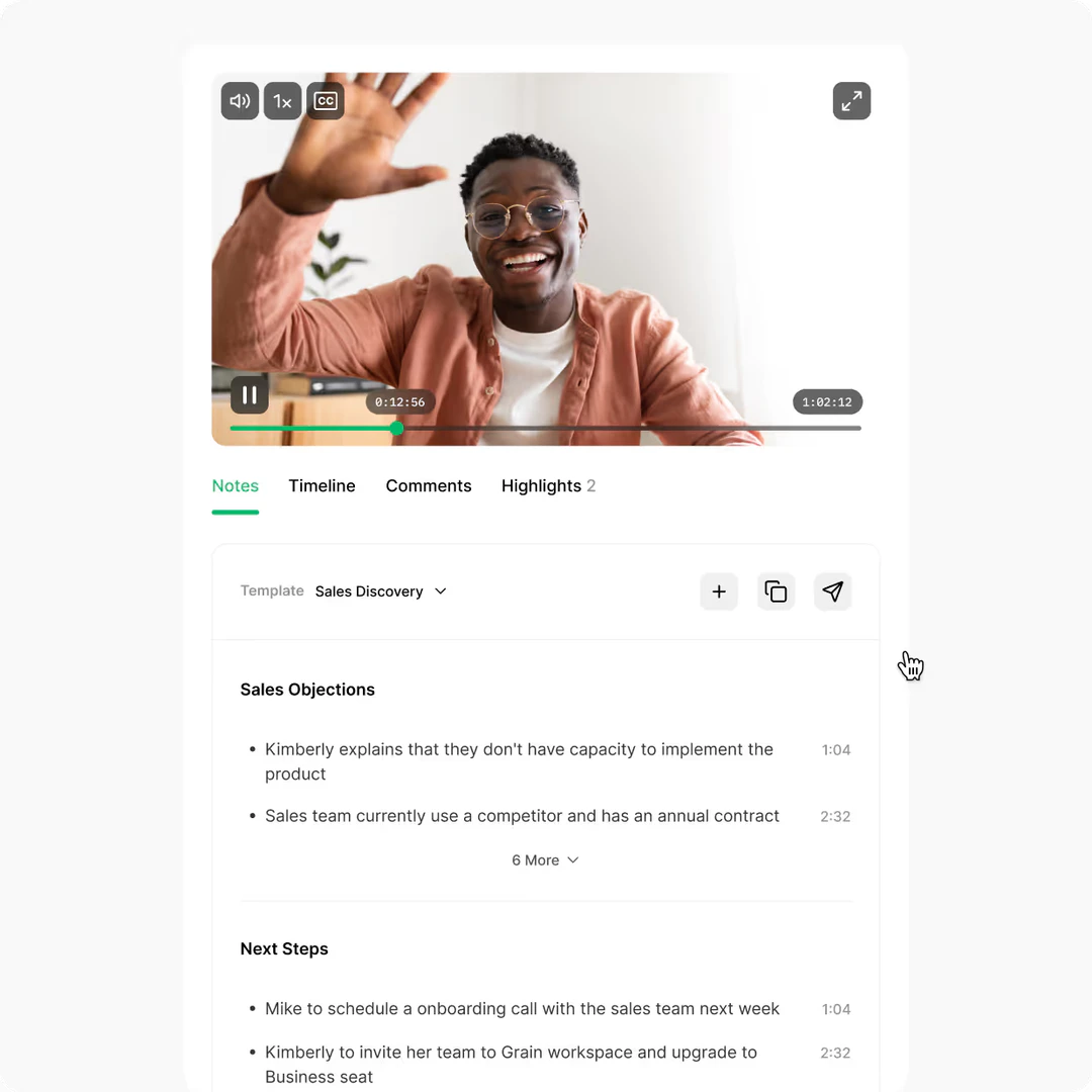 - After the meeting, access your notes and insights on the Grain platform, and share them with your team via integrated tools.