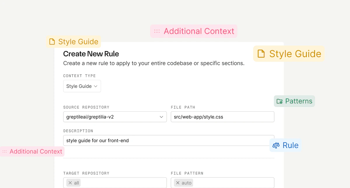 - Custom Rules: Users can define their own coding standards and rules, which Greptile will enforce across all PRs.