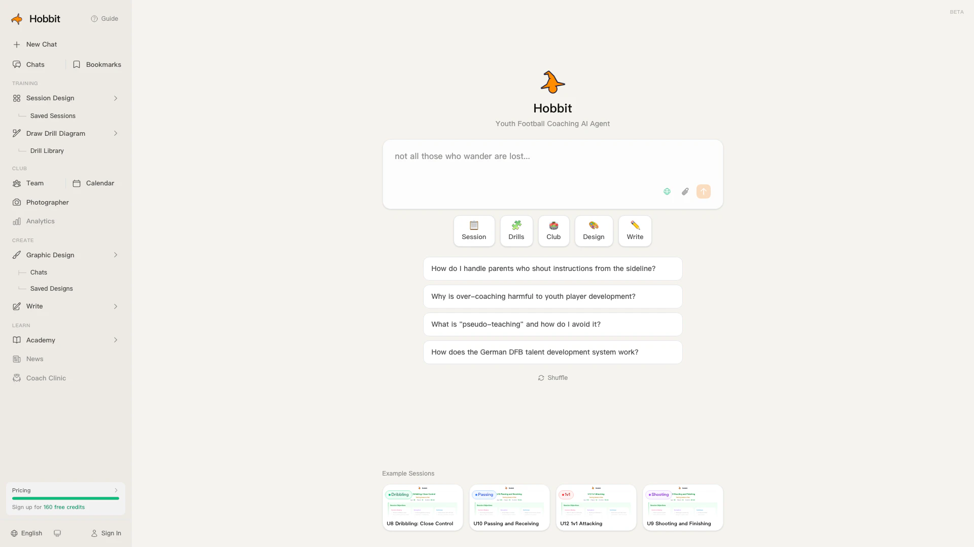 Hobbit is a specialized Youth Soccer AI designed specifically for coaches and academies. This innovative tool streamlines the process of training by allowing coaches to design sessions, draw drills, manage teams, and plan entire seasons efficiently. With a focus on youth soccer, Hobbit combines advanced AI capabilities with user-friendly features to enhance coaching effectiveness and player development.