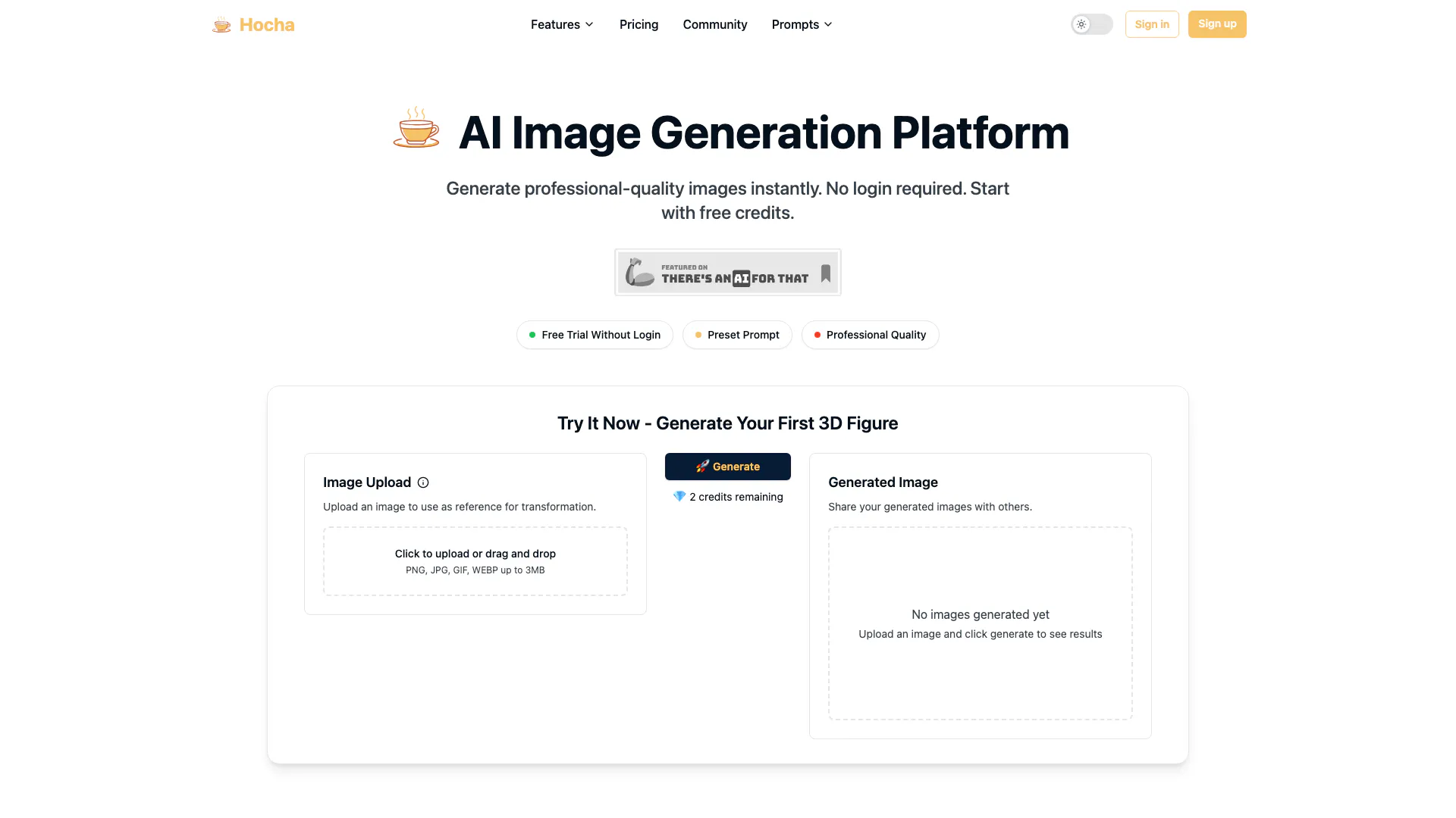 Hocha is an AI image generation platform that allows users to create professional-quality images instantly without the need for an account. It offers a free trial with preset prompts, making it accessible for anyone looking to generate stunning visuals quickly. Users can upload images to transform them into 3D figures or utilize various AI tools to enhance their creations.
