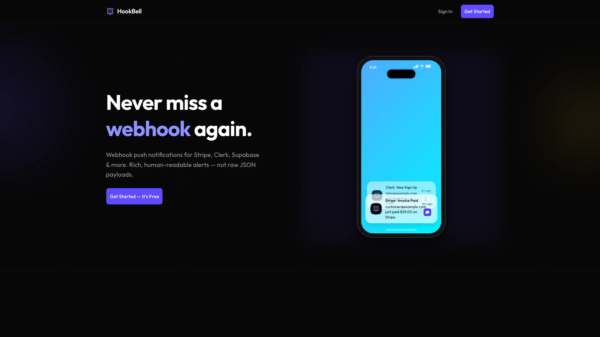 Hookbell is a developer-focused tool designed to provide webhook[1] push notifications[2] from various services like Stripe, Clerk, and Supabase. Unlike traditional webhook systems that send raw JSON payloads, Hookbell delivers rich, human-readable alerts directly to your mobile device. This ensures that developers can instantly receive and understand important events without the need for complex parsing. With Hookbell, you can create unique webhook connections for each service you monitor, enabling a streamlined and efficient workflow.