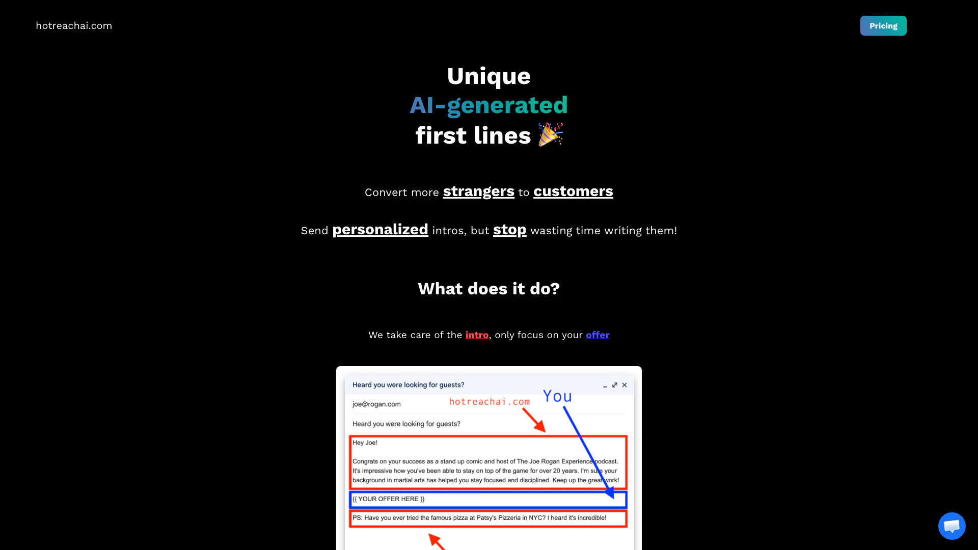 - AI-Generated Personalized Intros: Hot Reach Ai generates unique first lines for cold emails, increasing the chances of converting strangers into customers.