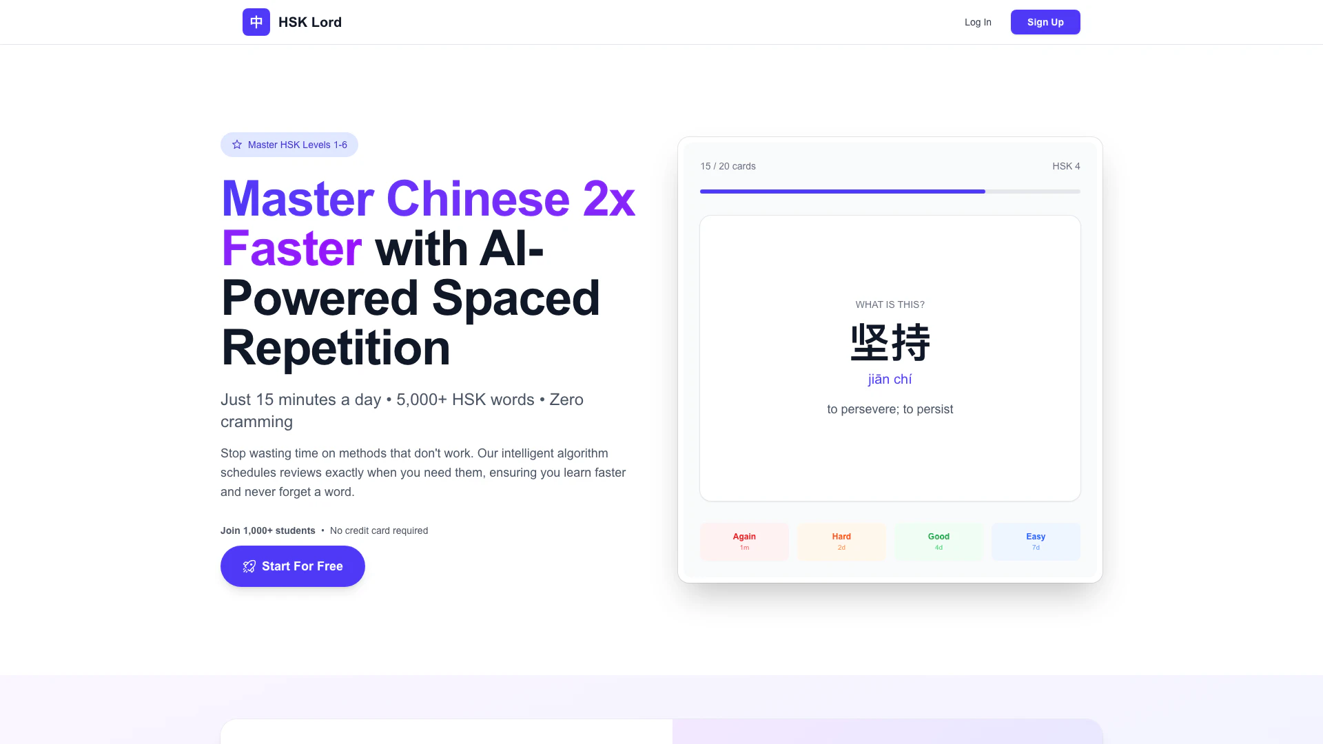 HSK Lord is a free Chinese learning app that uses spaced repetition to help users master over 5,000 vocabulary words from HSK levels 1 to 6.