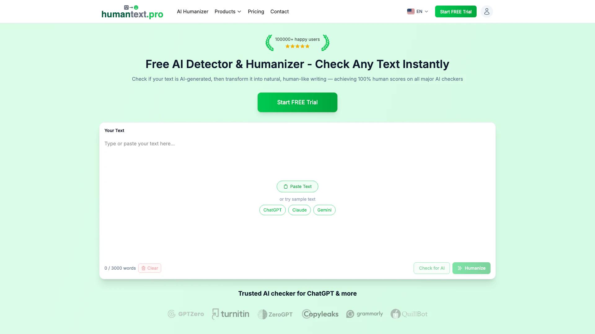 5,000 words per month. Score human on all AI checkers (incl. Turnitin & GPTZero), Unlimited AI detection, Basic Humanization Engine, Plagiarism-free, Error-free rewriting, Undetectable results, 20 languages supported.