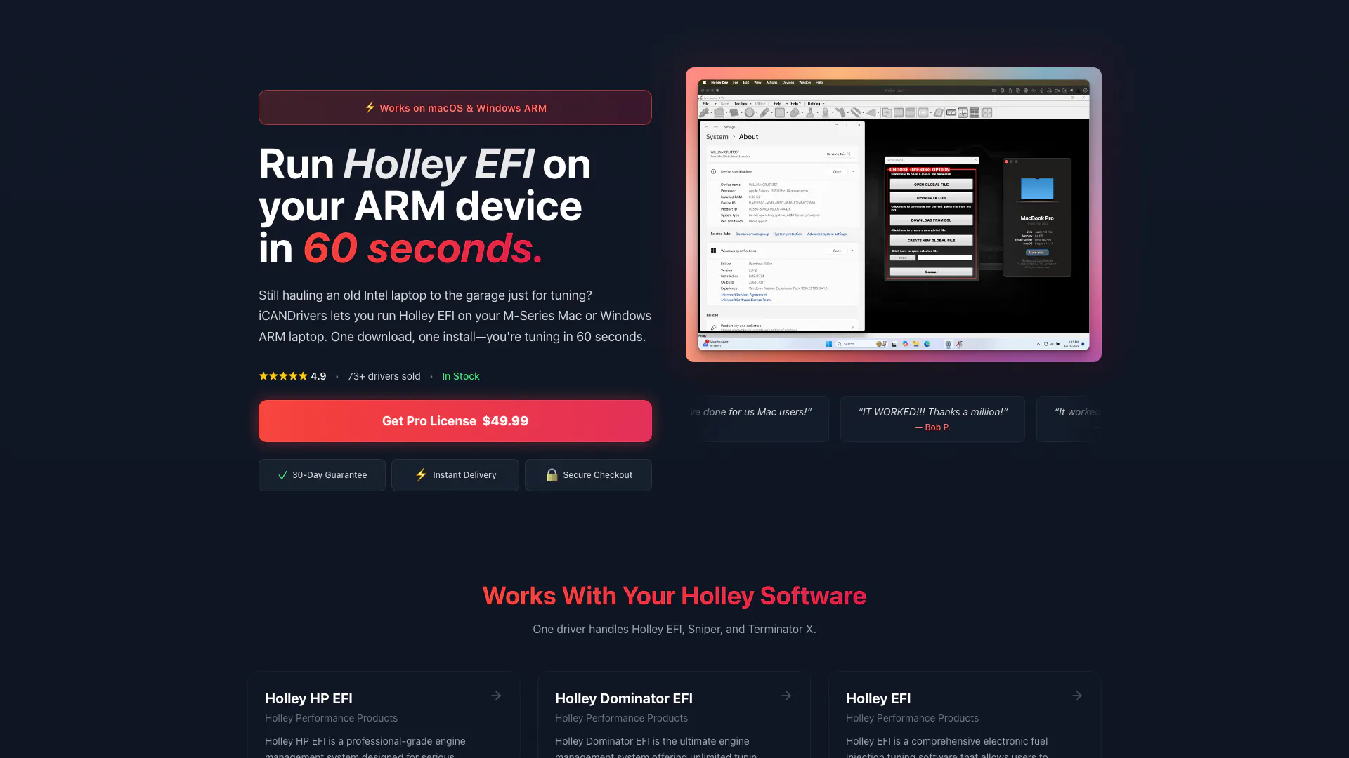 iCANDrivers provides custom CAN bus drivers that enable Holley EFI tuning software (Holley EFI, Sniper EFI, Terminator X) to run on ARM-based devices like M-Series Macs and Windows ARM laptops.