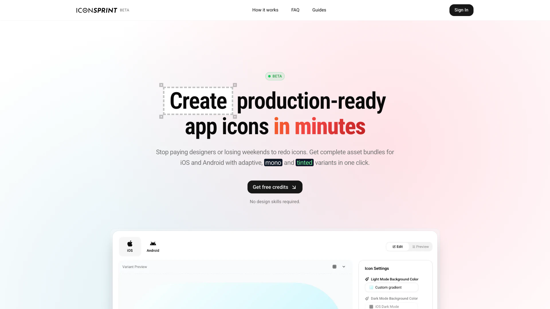 IconSprint is a powerful online tool designed for mobile app developers[3] that enables users to create production-ready app icons[2] in just minutes. By eliminating the need for design skills, IconSprint provides a user-friendly interface where users can generate complete asset bundles for both iOS and Android platforms. The tool offers adaptive, monochromatic, and tinted icon variants with just a single click, significantly speeding up the icon creation process and enhancing productivity.