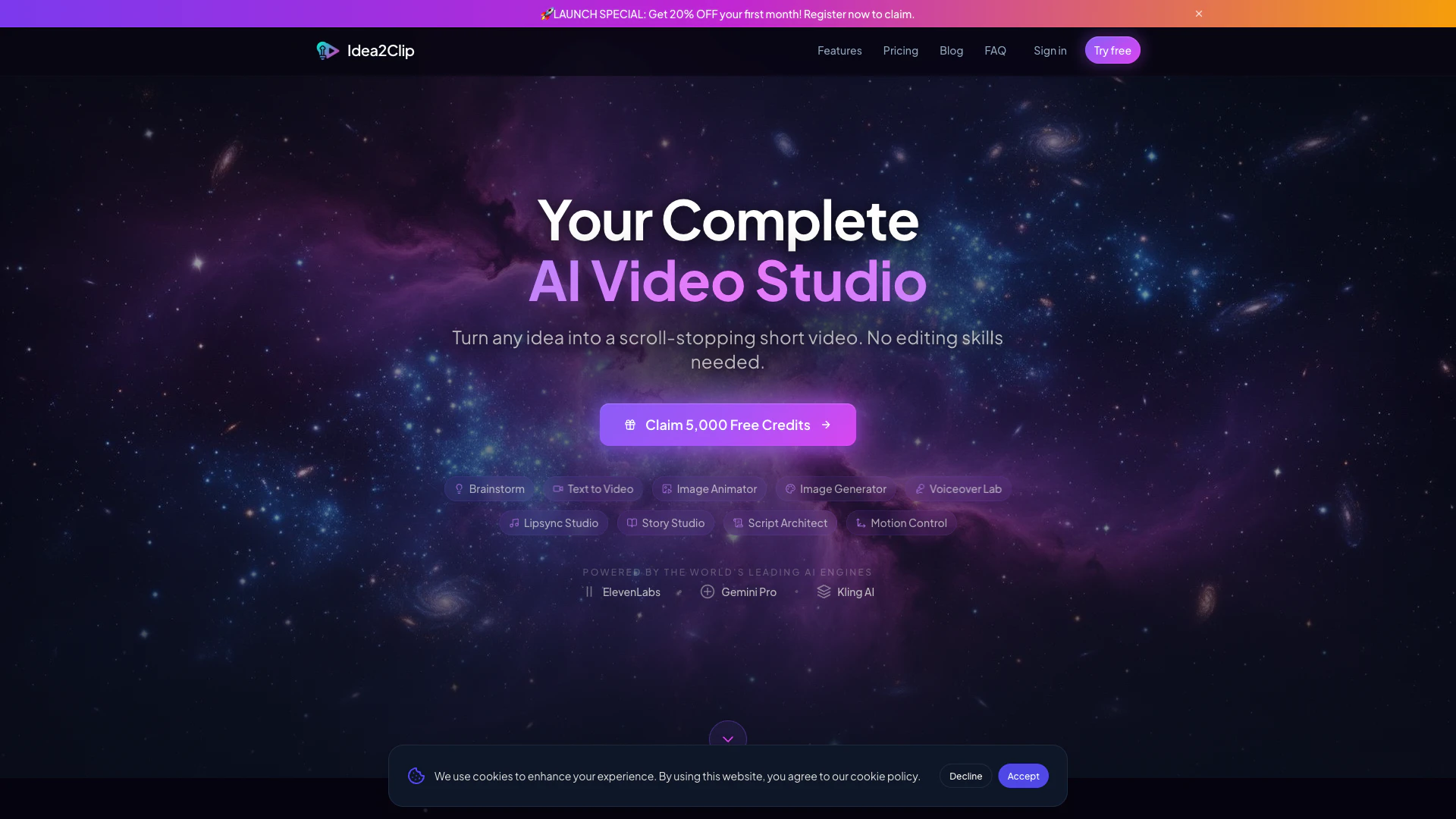 - Sign Up: Visit the Idea2Clip website and create a free account to start with 3,000 credits.
