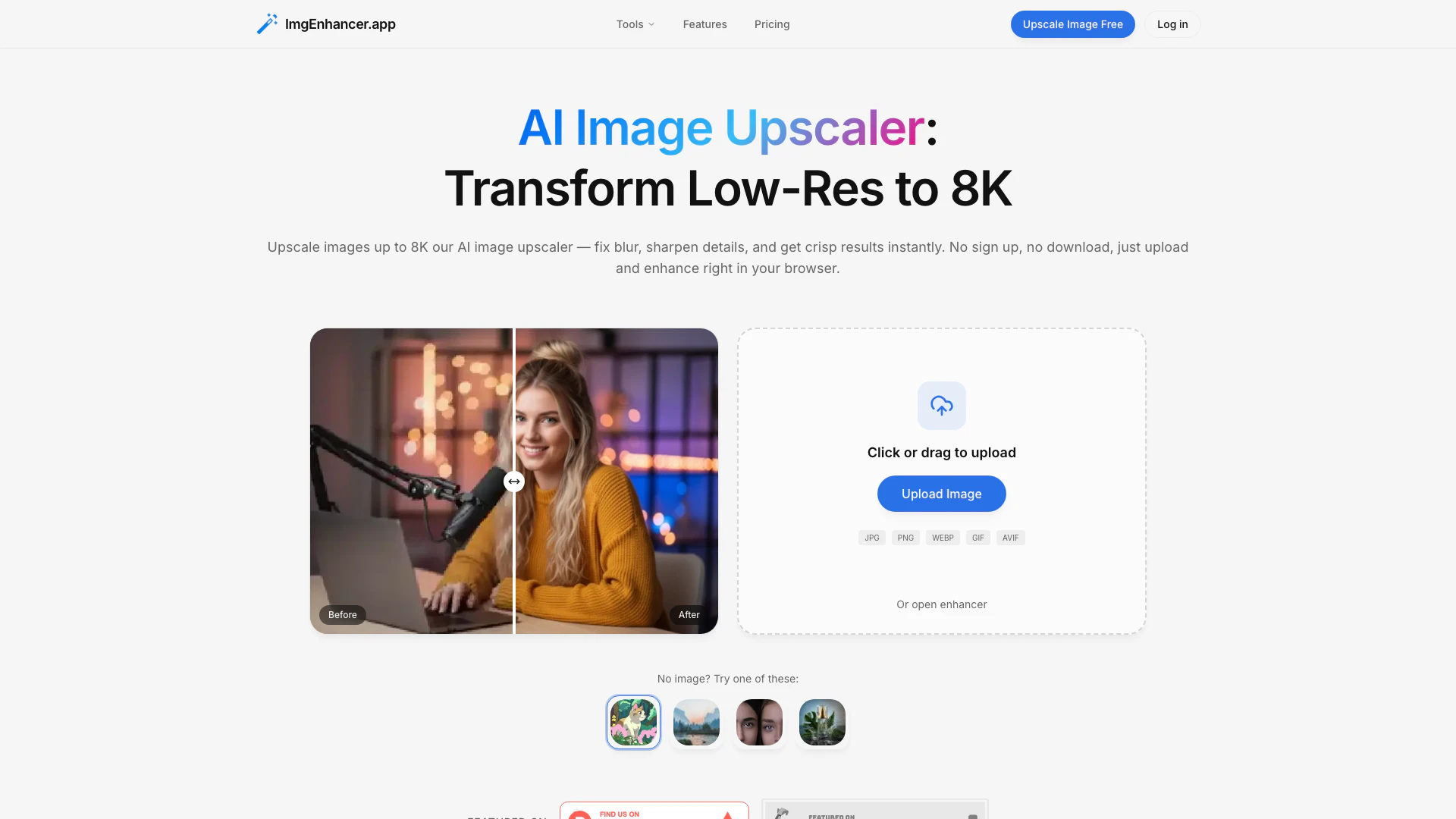 - User-Friendly Interface: No sign-up is required, and the interface is simple, allowing users to upload and enhance images easily.