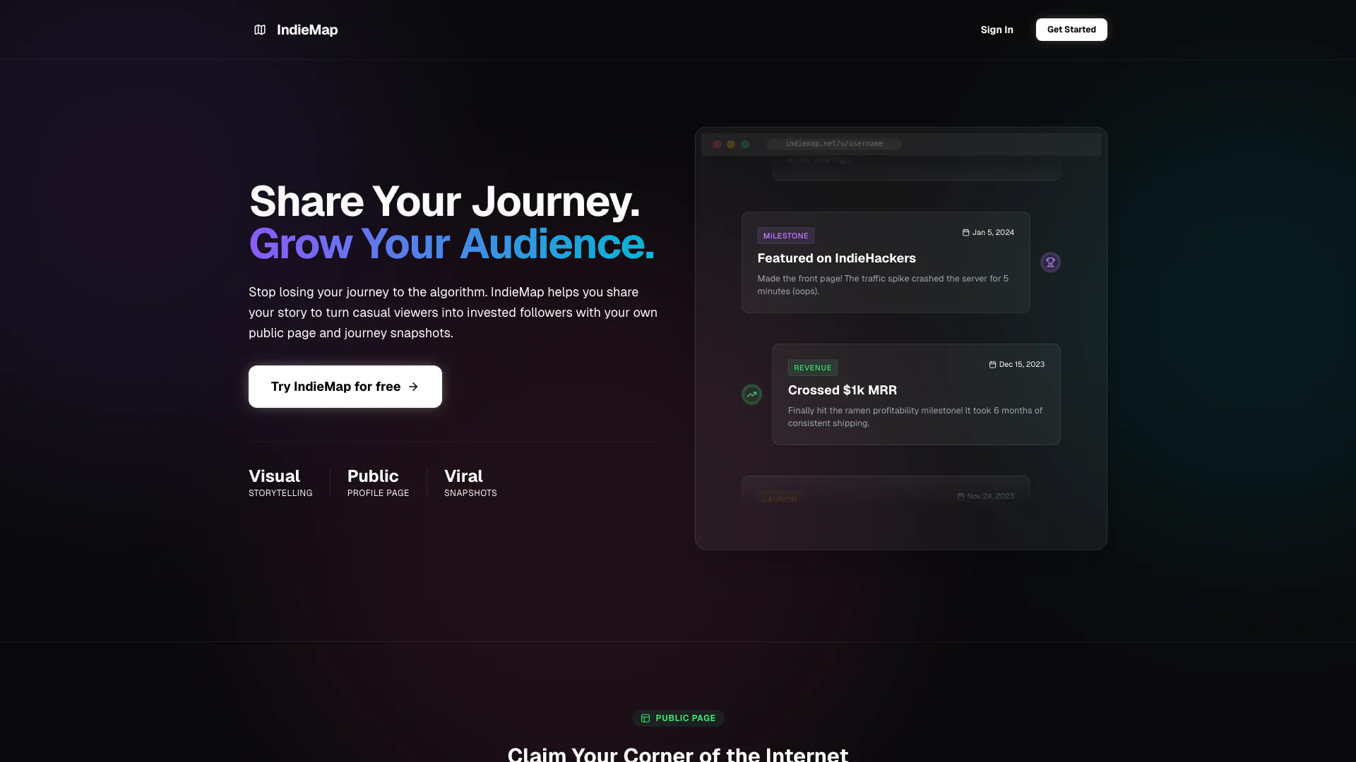 Everything you need to build trust and show momentum. Your own public profile page (indiemap.net/u/username), Viral social media snapshots with multiple themes, Dofollow backlinks to your projects, Unlimited milestones & updates, Beautiful visual timeline, Priority support.