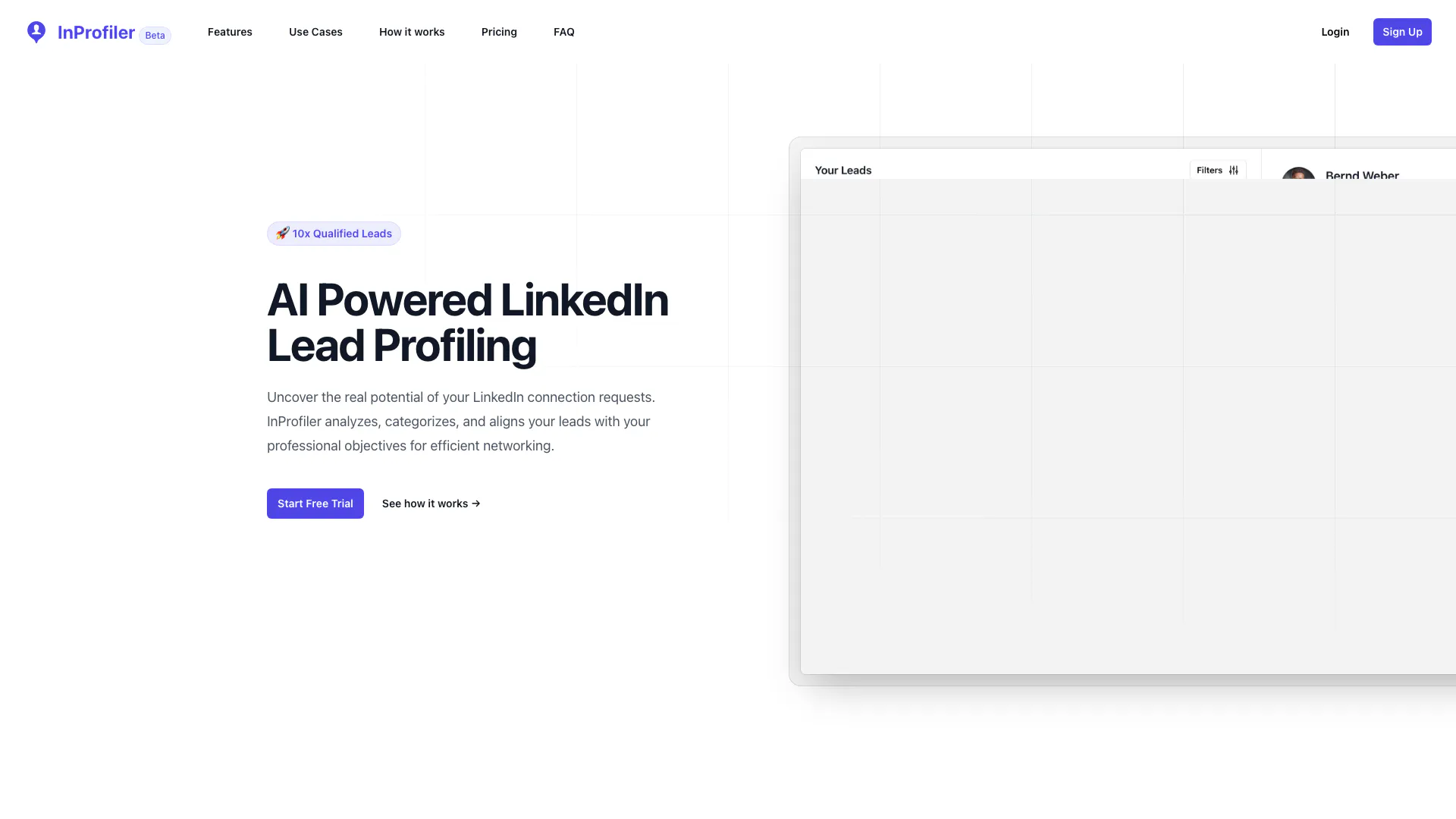 Inprofiler is an AI-powered LinkedIn lead profiling tool that analyzes, categorizes, and aligns your LinkedIn connection requests with your professional objectives, optimizing your networking efforts.