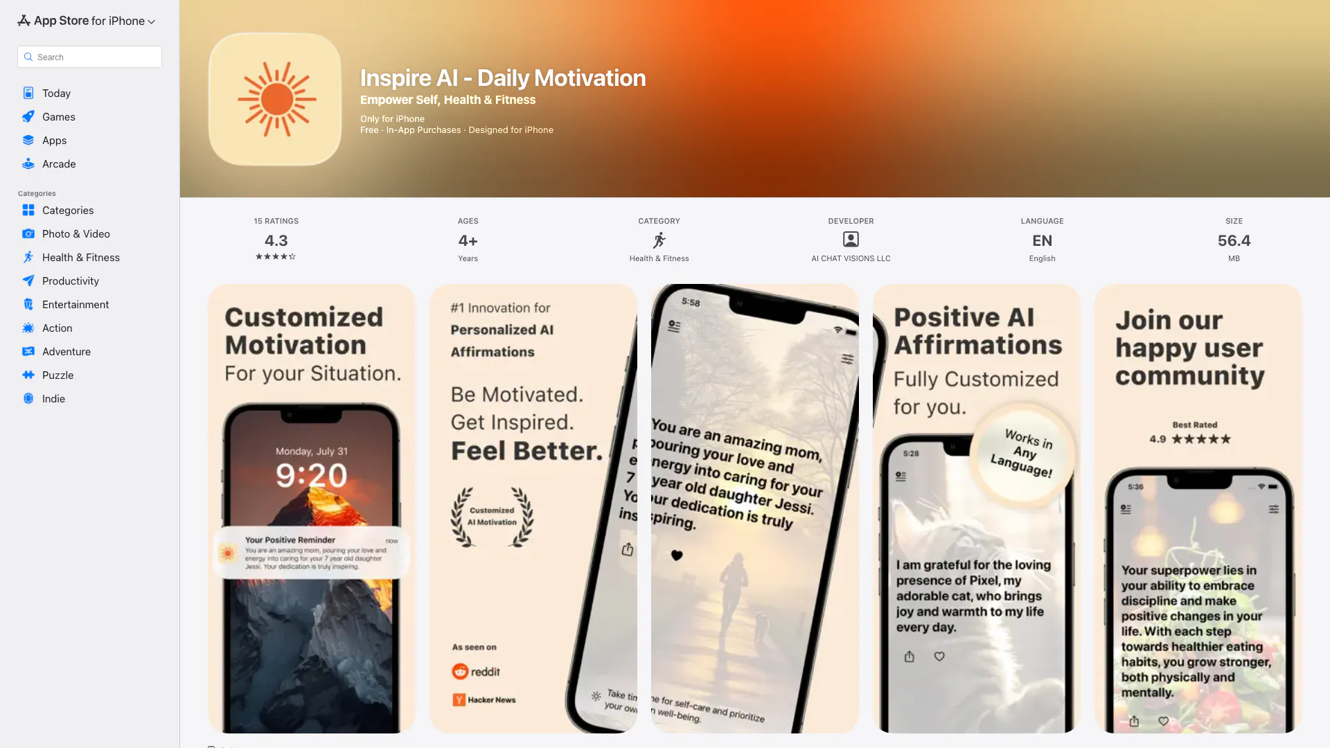 Inspire Ai is an application that provides personalized AI affirmations and motivation, designed to enhance users' health, fitness, and mindset, helping them achieve self-growth and offering endless positivity.