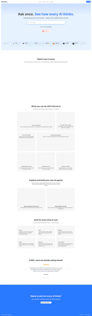 Internet.io is an innovative platform that allows users to search once and instantly compare answers from multiple AI models, including OpenAI, Grok, Perplexity, and Meta AI. It provides a smarter way to explore, create, and share custom AI agents tailored to various tasks. This tool is designed for users who want to leverage the strengths of different AI models, enabling them to obtain diverse perspectives on any given question. With Internet.io, users can easily organize and manage their interactions with AI, making it an essential tool for research, writing, coding, and more.