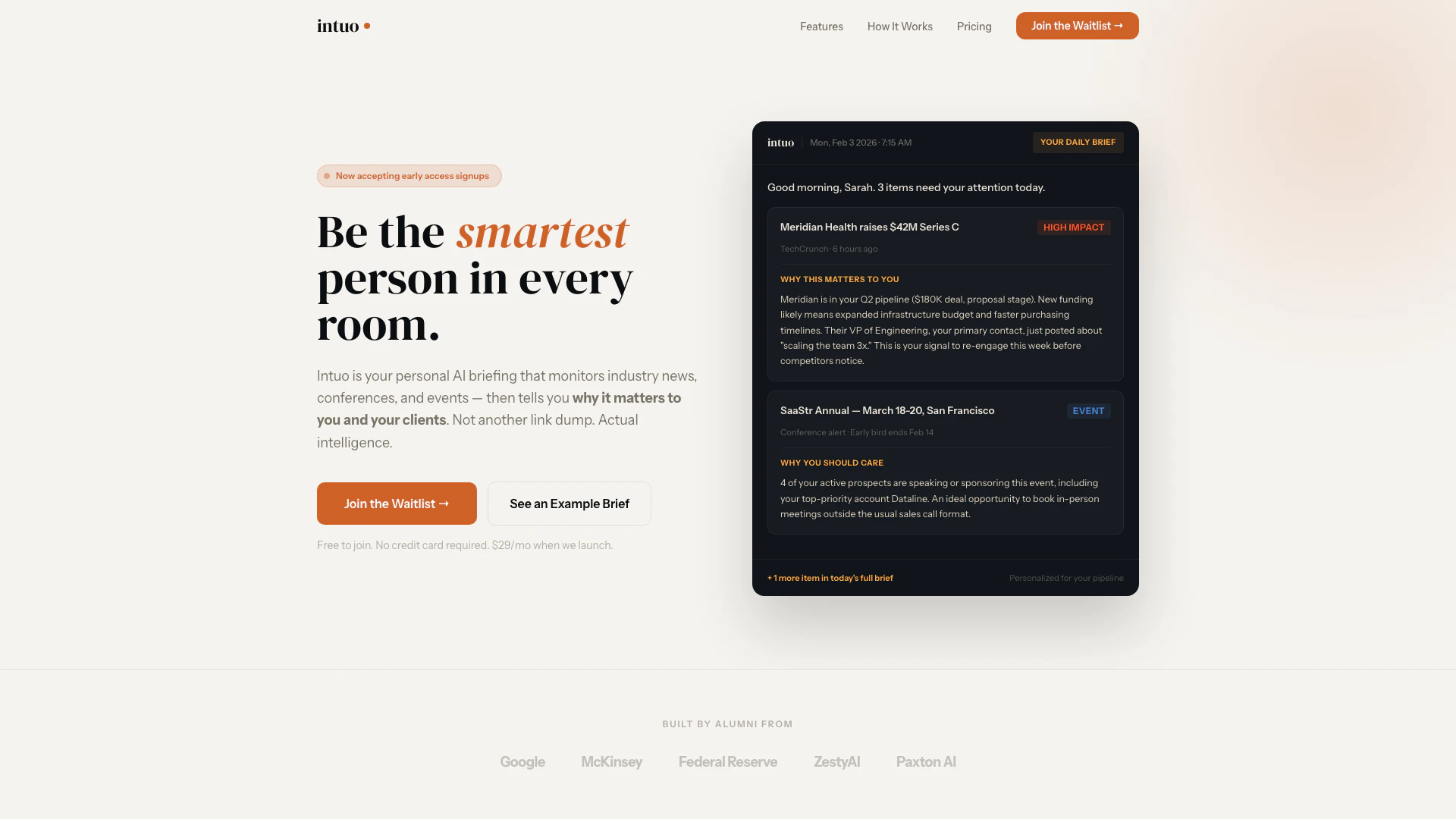 Intuoai is an AI-powered tool that provides daily briefings by monitoring industry news, conferences, and events, and explains why this information is relevant to you and your clients.