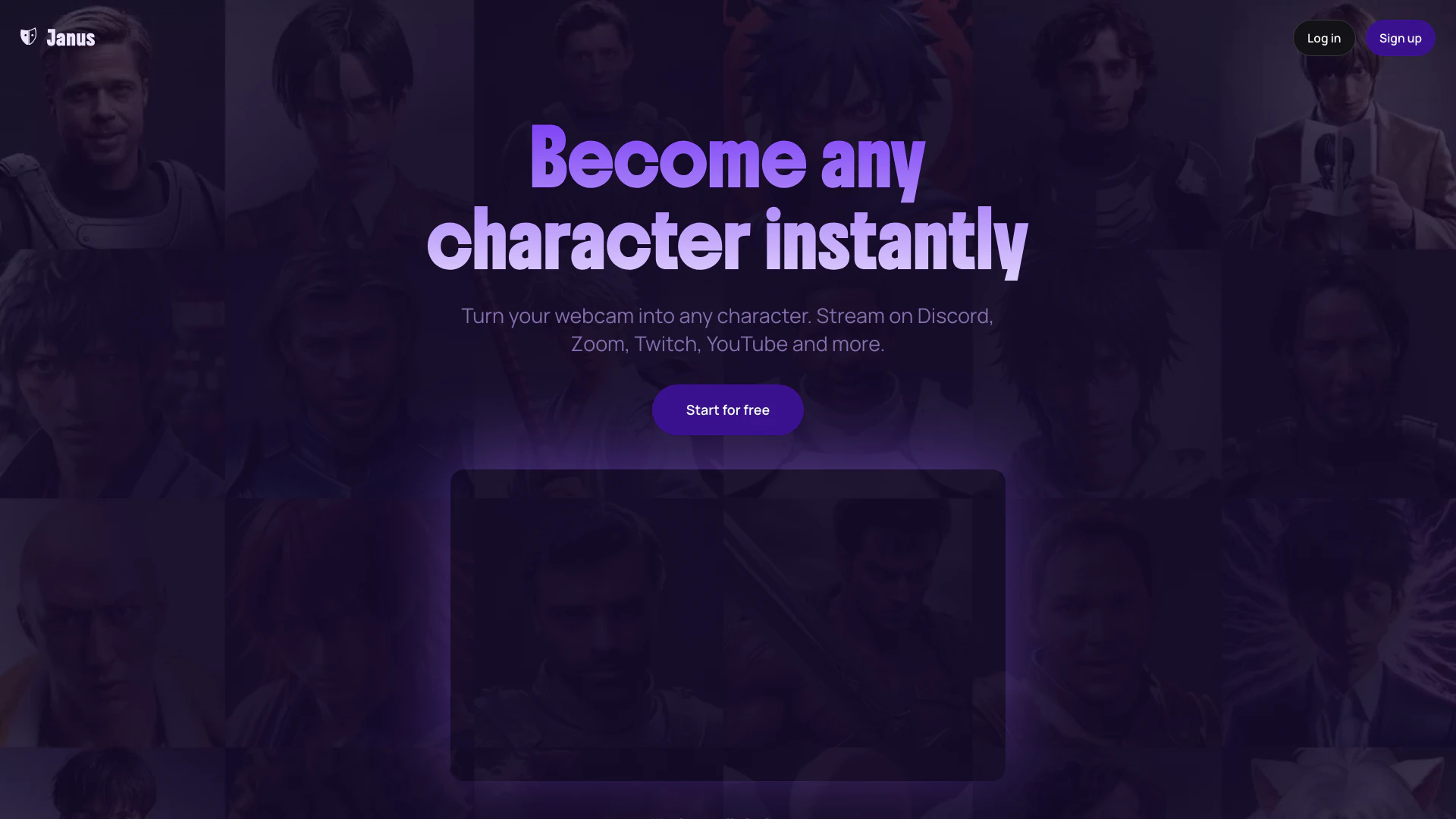 Janus is a real-time character animation platform that lets you become any character using just your webcam. Your avatar is rendered directly in your browser, driven by your facial expressions and movements. Use it on Discord, Zoom, Twitch, YouTube, and more — no special hardware or setup required.