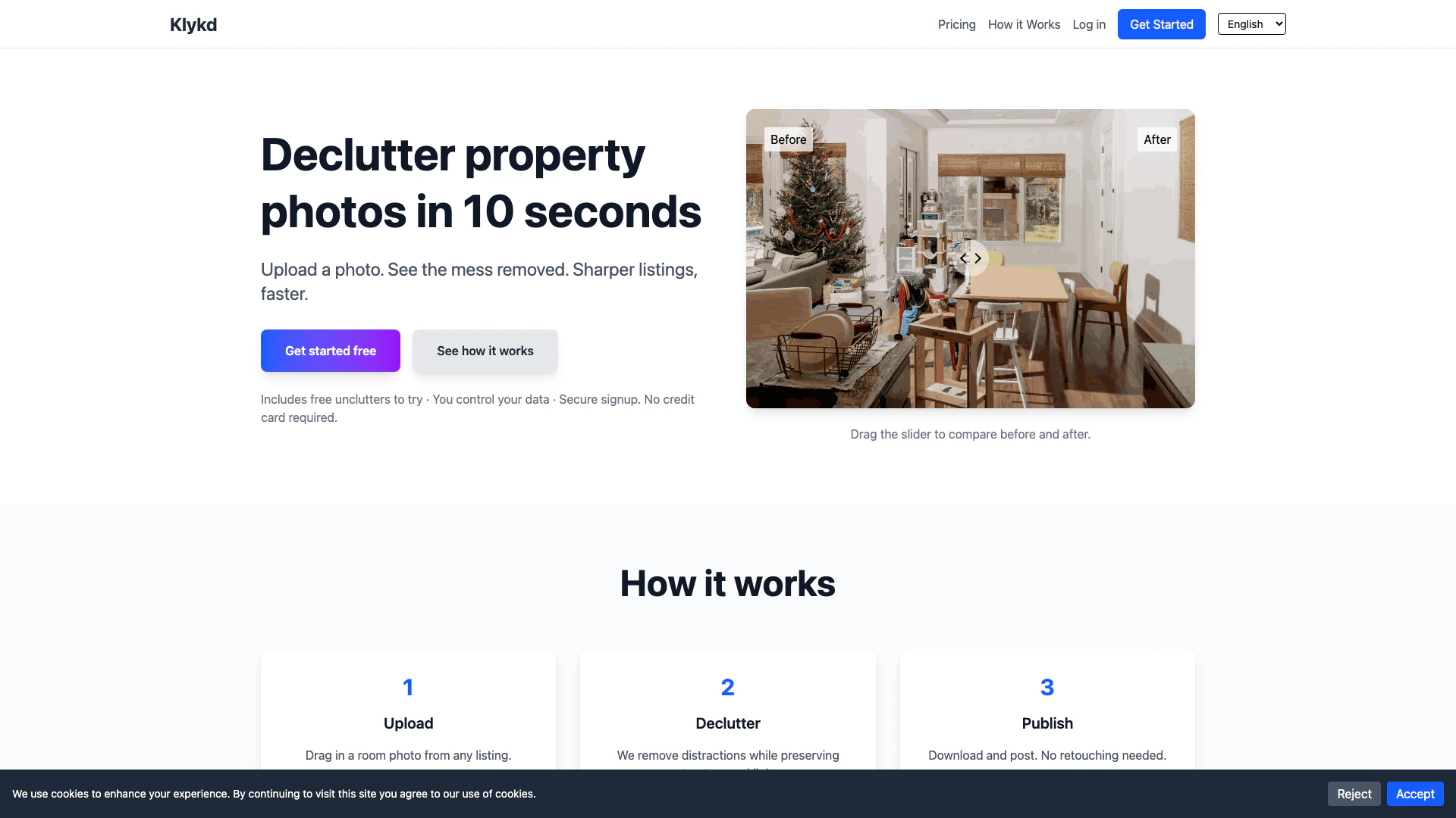Klykd is an innovative online tool designed to help real estate[3] professionals and homeowners declutter[2] property photos quickly and efficiently. By utilizing advanced image processing[1] technology, Klykd allows users to upload images of rooms and automatically removes distractions, enhancing the overall appearance of the listings. This process not only sharpens the visual appeal of the property but also saves time, enabling faster listings and attracting more potential buyers. Klykd's core value lies in its ability to transform cluttered images into polished, market-ready photos in just 10 seconds, making it an essential tool for anyone in the real estate market.