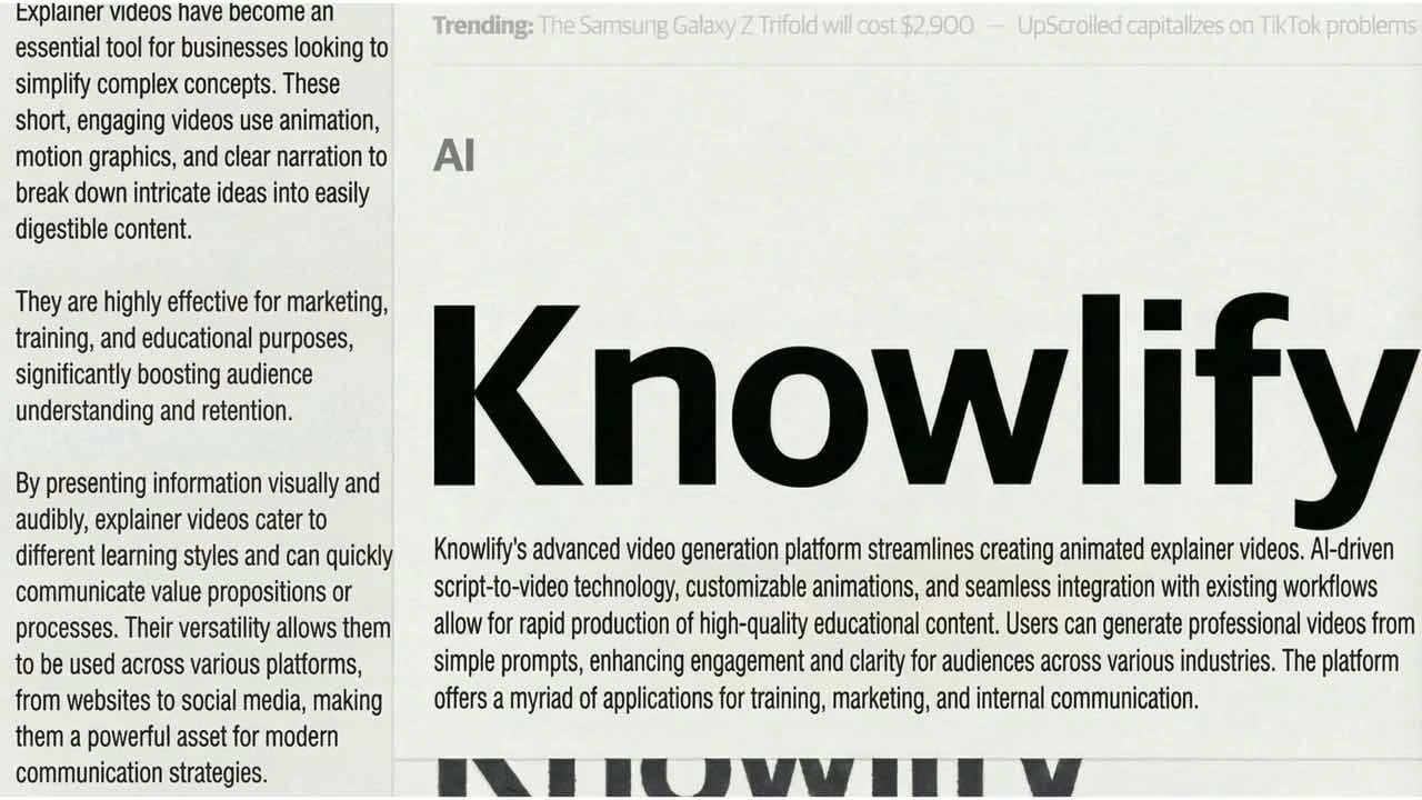 Knowlify is an AI-powered animated explainer video maker that allows companies to turn documents, scripts, and ideas into professional animated videos in minutes, without needing design skills.
